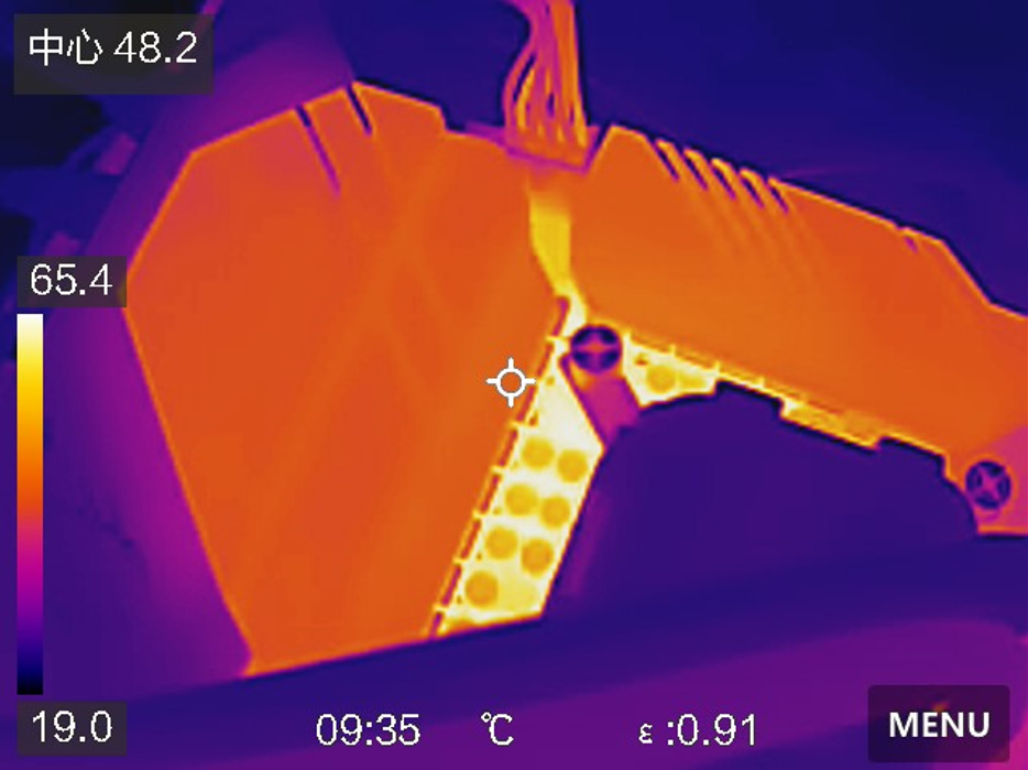 在考機測試的同時,我們也用熱成像儀考查了其發熱狀況。供電模塊區域最高溫度也不過65℃,其散熱表現不錯。
