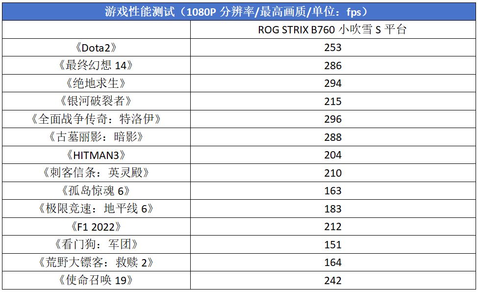 在大家最關心的遊戲性能方面,我們選擇了十幾款熱門遊戲進行測試。綜合款遊戲的幀率表現來看,ROG B760小吹雪S主板搭配i7-13700K和RTX 4090 高端遊戲平臺的表現同樣出色,不論是電競網遊還是3A遊戲大作的幀率都表現都十分出色,充分發揮了處理器和顯卡的應有性能,可以爲玩家帶來非常流暢的遊戲體驗。