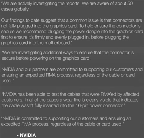 NV在调查中指出:“在调查中他们发现,是连接器没有完全插入显卡。为了帮助确保连接器是安全的,我们建议在将显卡插入主板之前,先将电源适配器插入显卡,以确保它牢固且均匀地插入。我们正在研究其他方法,以确保连接器让用户更好、更容易的操作,降低因操作不当引起的起火燃烧。”