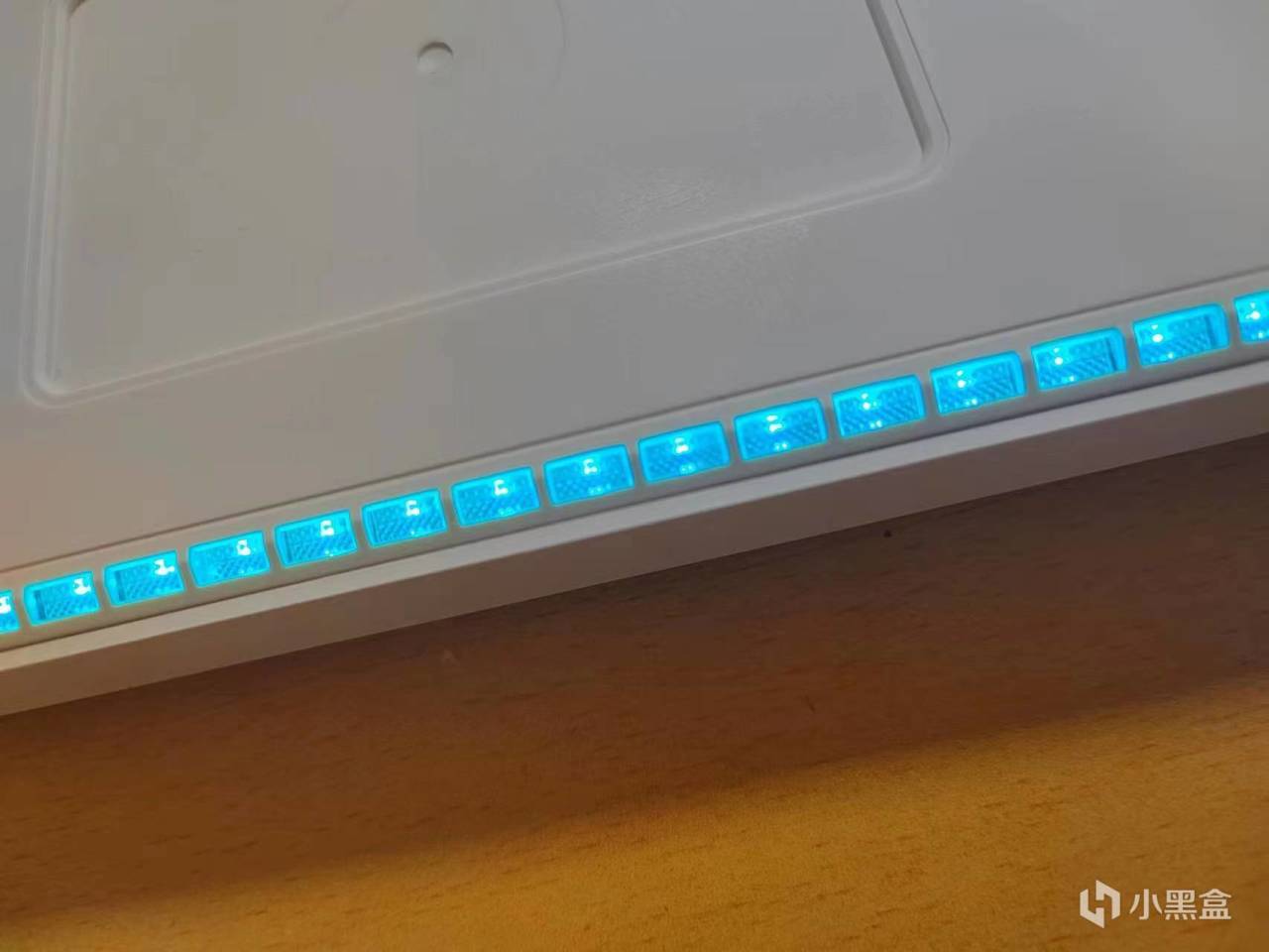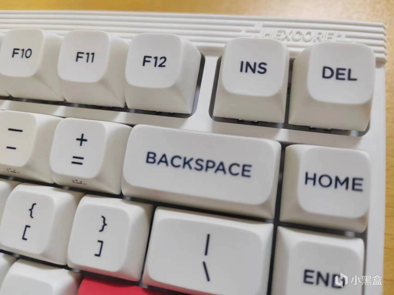 初用这款键盘,因为其使用的是紧凑84键的布局设计,所以键位布局略显紧凑,除了顶部留空略宽,两侧和下部的留空均较小,正面整体看起来很清爽,并没有臃肿的设计过于花里胡哨的其他功能,宽的额头在线条的修饰下也没有突兀的厚重感,LED指示灯和HEXCORE的logo则完美的融合在顶部线条中,规整的外观看起来也很赏心悦目。