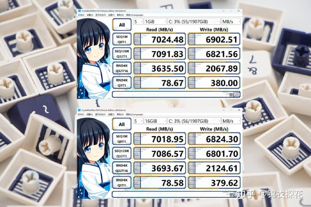 KC3000采用PHISON E18主控+原厂3D TLC NAND的搭配,可以说是目前中高端PCIe4.0 SSD里比较优秀的一个设计方案,也是当下PCIe4.0 SSD的第一梯队主力。CrystalDiskMark里,1GB测试下的顺序读取为7024MB/s、顺序写入为6902MB/s;32GB测试下的顺序读取为7018MB/s、顺序写入为6824MB/s。