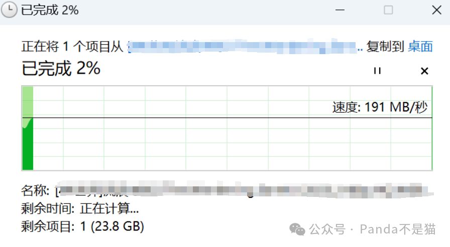 PC测试后咱们再来到NAS环境测试实际读写速度。将NAS硬盘映射到电脑,首先大文件的测试,这里用4K影视资源作为测试文件来到了20多GB,测的速度为191MB/s,这个速度基本趋于测试速度了。