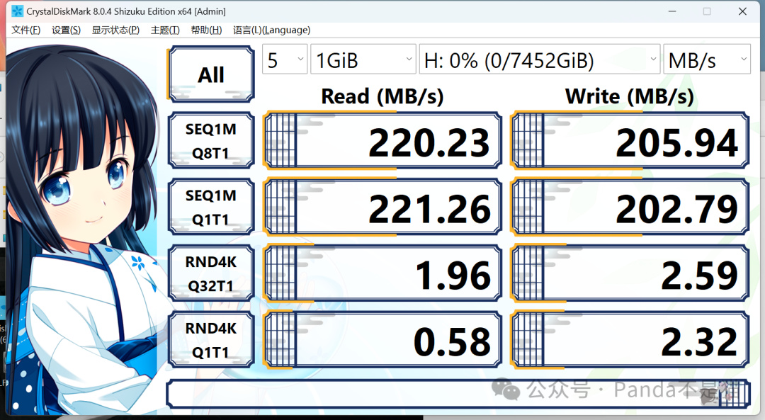 随后使用CrystalDiskMark测试速度,在PC环境下测的平均读取速度为220MB/s,写入速度为205MB/s。测试数据和官方宣传基本一致。