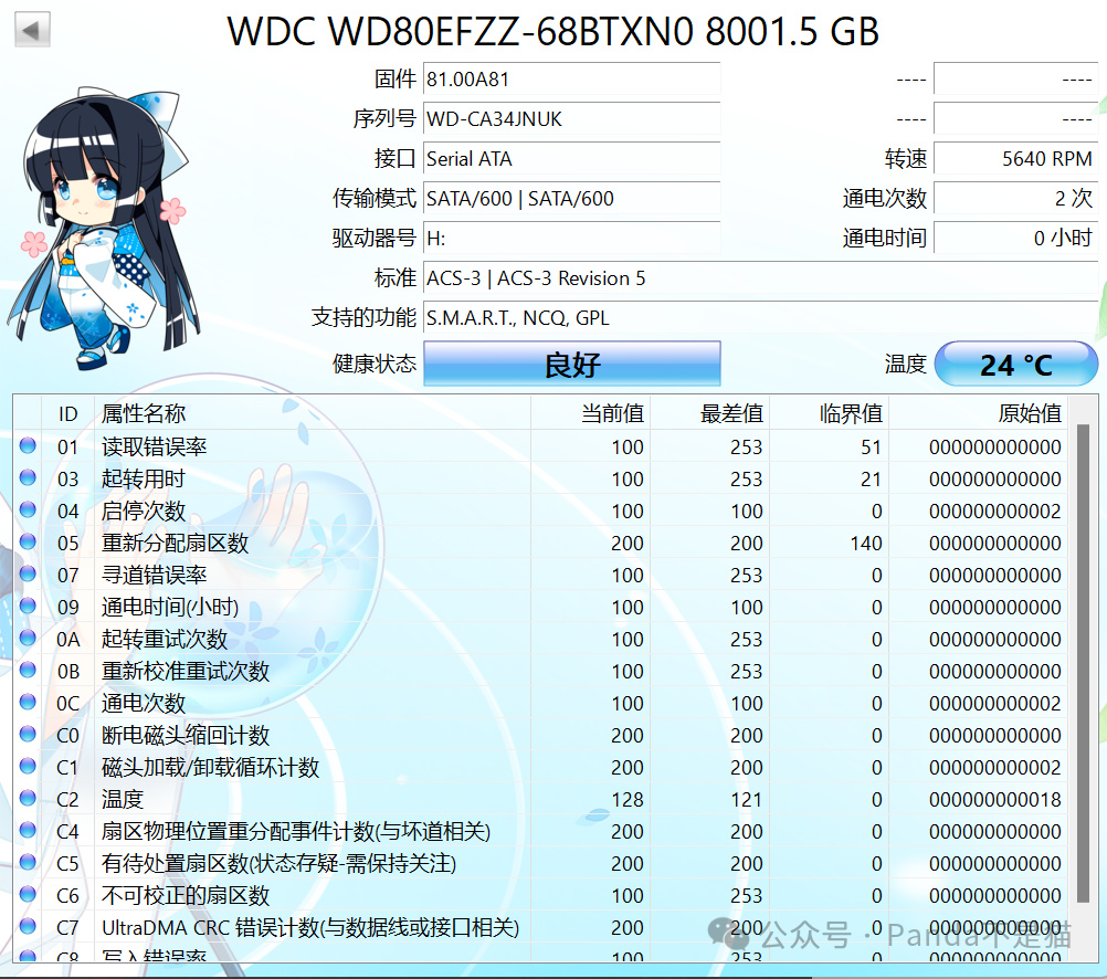 实践出真招,直接上盘测试。该盘通过正规电商渠道够得,首先这里先用PC看一下硬盘的各项健康数据检查是否全新盘,通过软件查看能看到通电次数仅为2次,通电时长0小时。当然了这样的方式仅用于理论,毕竟硬盘水还是很深,所以建议大家购买还是要去西数在各大电商平台的旗舰店或自营店购买。