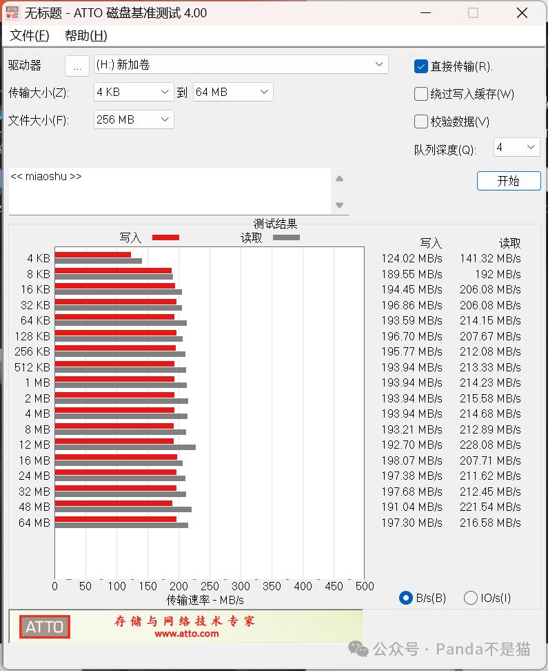 鉴于NAS使用时会出现各种读写情况,比如大量小文件的读取写入,超大文件的读取写入,所以这里我又用ATTO做了硬盘的基准测试,目的就是测试各种传输情况下的传输速度。通过ATTO基准测试可以看到4kb文件读取在124MB/s,写入为141MB/s,在文件大于16kb后速度基本就趋于稳定了。