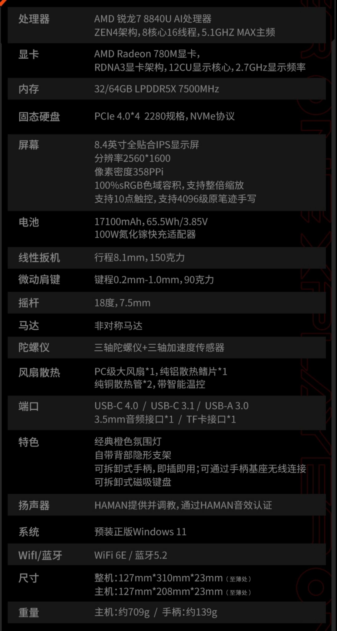 其他方面:内置由哈曼提供并通过哈曼品牌音效认证的双立体扬声器;内置 65.5Wh 容量电池,配备 100W 氮化镓充电器;支持WiFi 6E和蓝牙5.2;手柄拥有双震动马达、加速度传感器和陀螺仪。