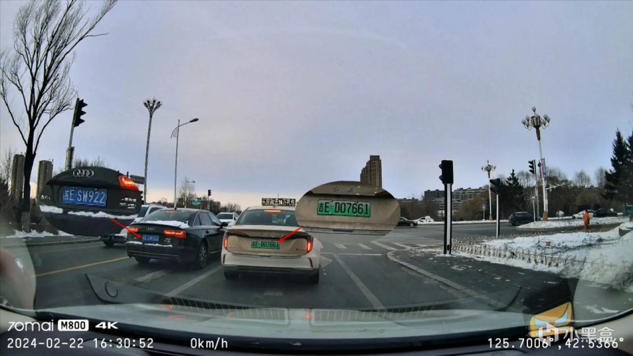 另外,因为70迈智能行车记录仪M800带有4G模块,能够进行准确的定位,除了能显示拍摄时间外,画面右下角会显示出准确的经纬度。这样的影像不仅清楚明了,作为举证材料也更有说服力。