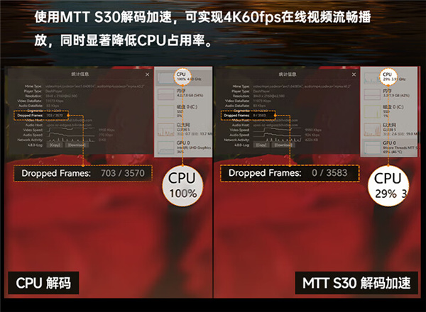 摩尔线程MTT S30支持H.264/H.265/AV1等格式编解码,可实现4K60fps视频播放。