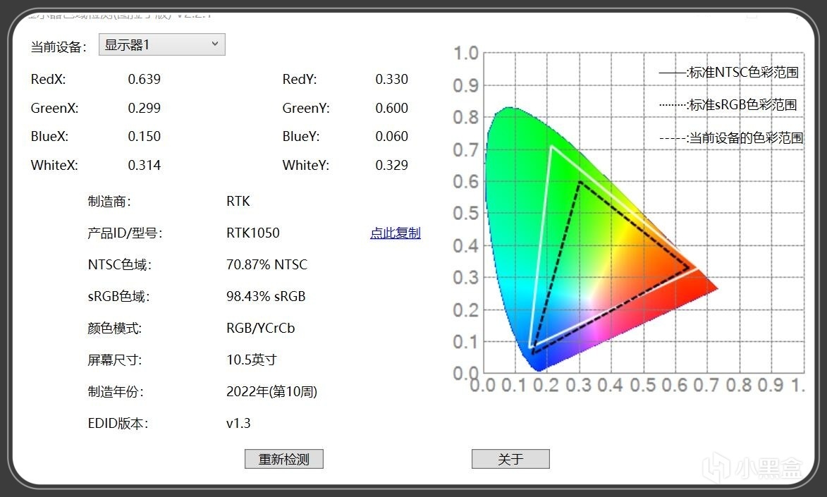 測到這邊,其實我對這塊屏幕的表現就非常滿意了,毫不客氣的說,這大概會是我後面很久的便攜屏+顯示器副屏,但咱畢竟也不是大博主,所以經常也會自購一些產品,大家擔心的事情我也可以理解,比如最重要的,既然說是蘇菲book2同款,你小子不會直接拿的拆機屏二次封裝吧!那我對此也是比較擔心,所以就將其連接到了電腦上進行了簡單的讀取,其屏幕生產時間是2022年的第10周,與產品上架時間並不一致,但也與蘇菲book2的上架時間差了幾年,那就證明,這款屏幕並不是拆機屏幕,而是正常的商品屏,同時其本身的年份也沒有太久,所以其表面也不會出現明顯的老化,畢竟不少筆記本出廠用的是奇美家19年的屏幕,相比較起來,2022年簡直就是新寶寶了。