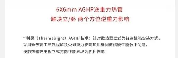 这款散热器号称使用了AGHP“逆重力热管”技术,通过全新的“工艺制程”,能够“解决热管受到重力影响毛细回流缓慢性能低下”的问题