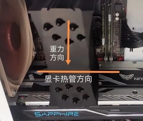 而当机箱以常规竖立时,显卡的热管全部平行于地平线。冷凝端与蒸发端齐平,重力几乎不影响显卡热管的运作,因此显卡温度也较此前上涨了4℃。