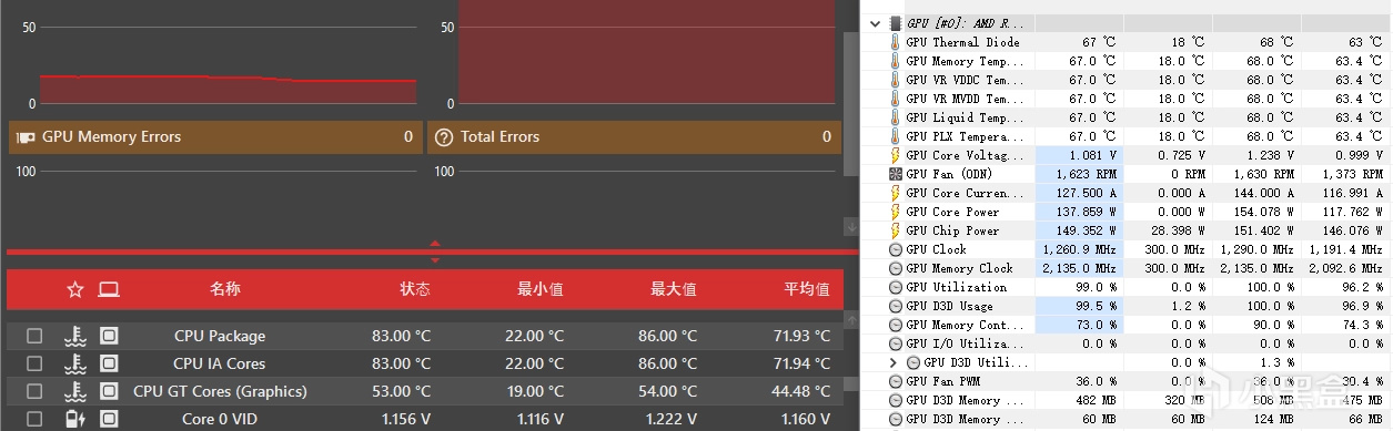 10分钟后,OCCT与HWINFO所记录的结果如图所示。