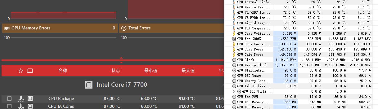 但HWINFO上记录的最高温度则是87℃,有上涨,不过还在正常水平。OCCT的温度监控同样基于HWINFO,这表明91℃可能只是瞬时极端值。