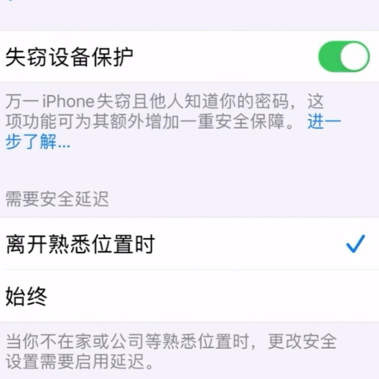在失窃设备保护菜单中,可以更加详细的自定义设置需要安全延迟。