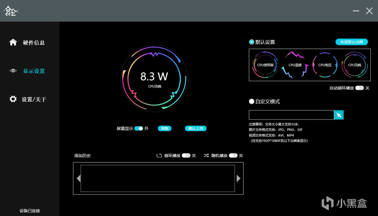 在顯示設置界面中可修改設定播放內容,比如設置顯示爲默認的處理器狀態信息,也可設置自定義模式,支持載入JPG、PNG、GIF、AVI與MP4等多媒體格式,單個媒體文件最大支持1GB,可同時載入多個媒體文件,兩個模式均支持開啓自動循環播放。