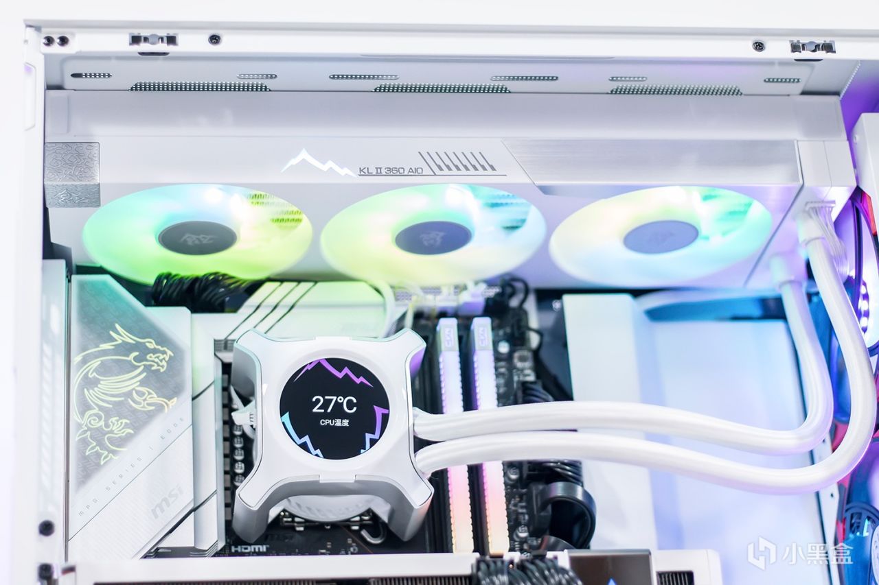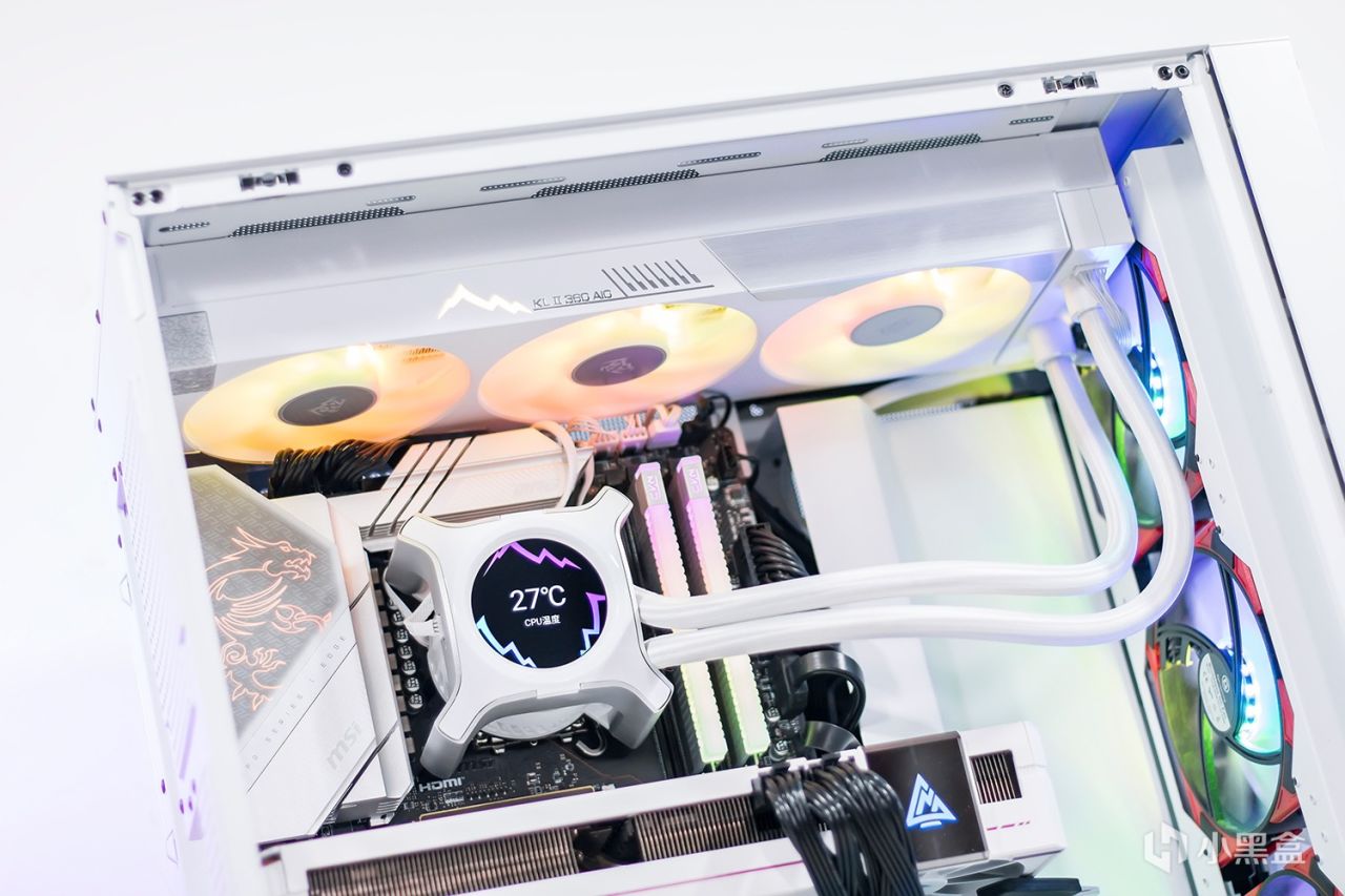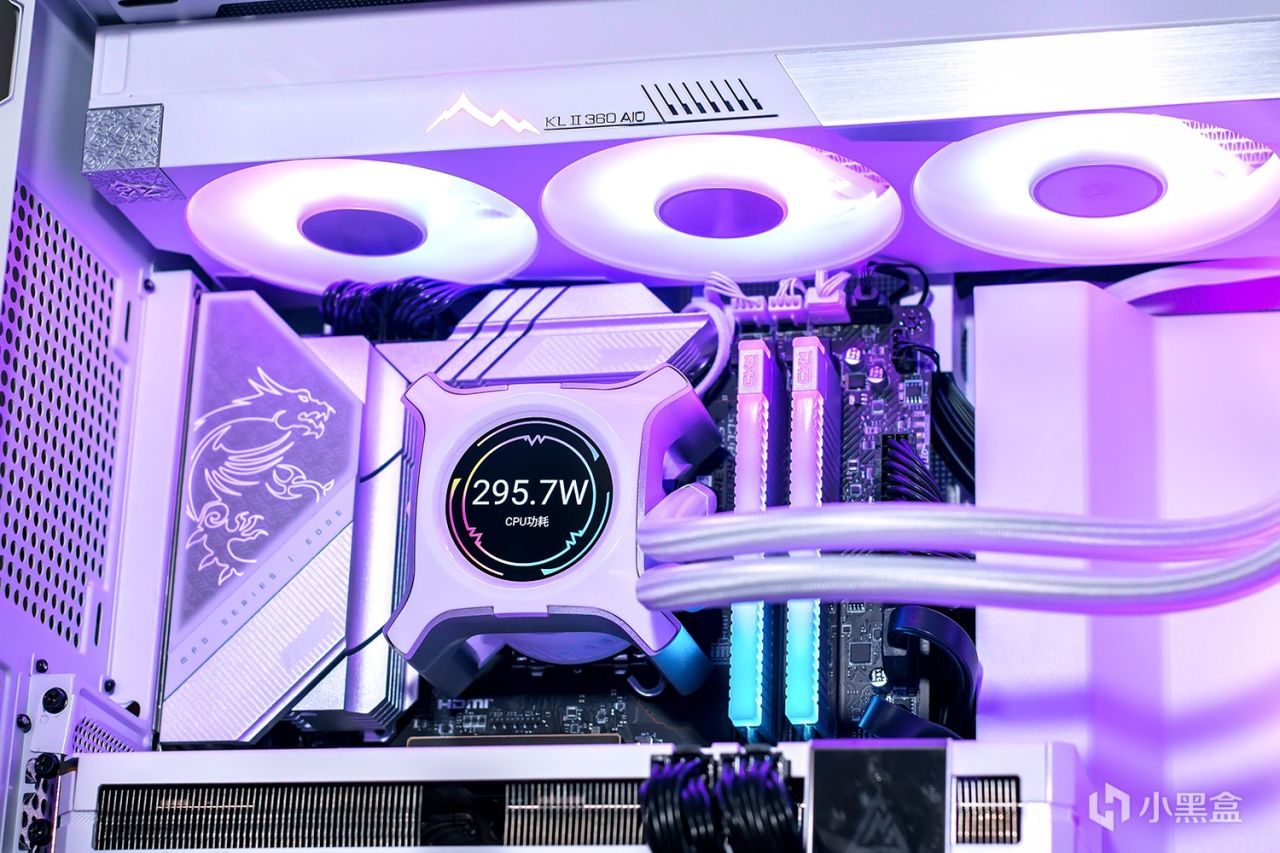 在最爲關鍵的散熱效果方面有着卓越表現,其標稱散熱功耗可達320W,經過實測能穩穩壓住i7-14700K處理器烤機滿載發熱,不受制於散熱盡情釋放性能,甚至還有餘力去應對小幅度超頻,能支撐起326W功耗的長時間考驗,可滿足旗艦級處理器的散熱需求,在運行噪音控制方面表現也很好,輕度負載時幾乎聽不到散熱風扇噪音,當全速運行時噪音基本仍處在可接受範圍內,水冷頭還內置了散熱風扇,可爲主板供電模組提供主動散熱,降低溫度提升供電穩定性。