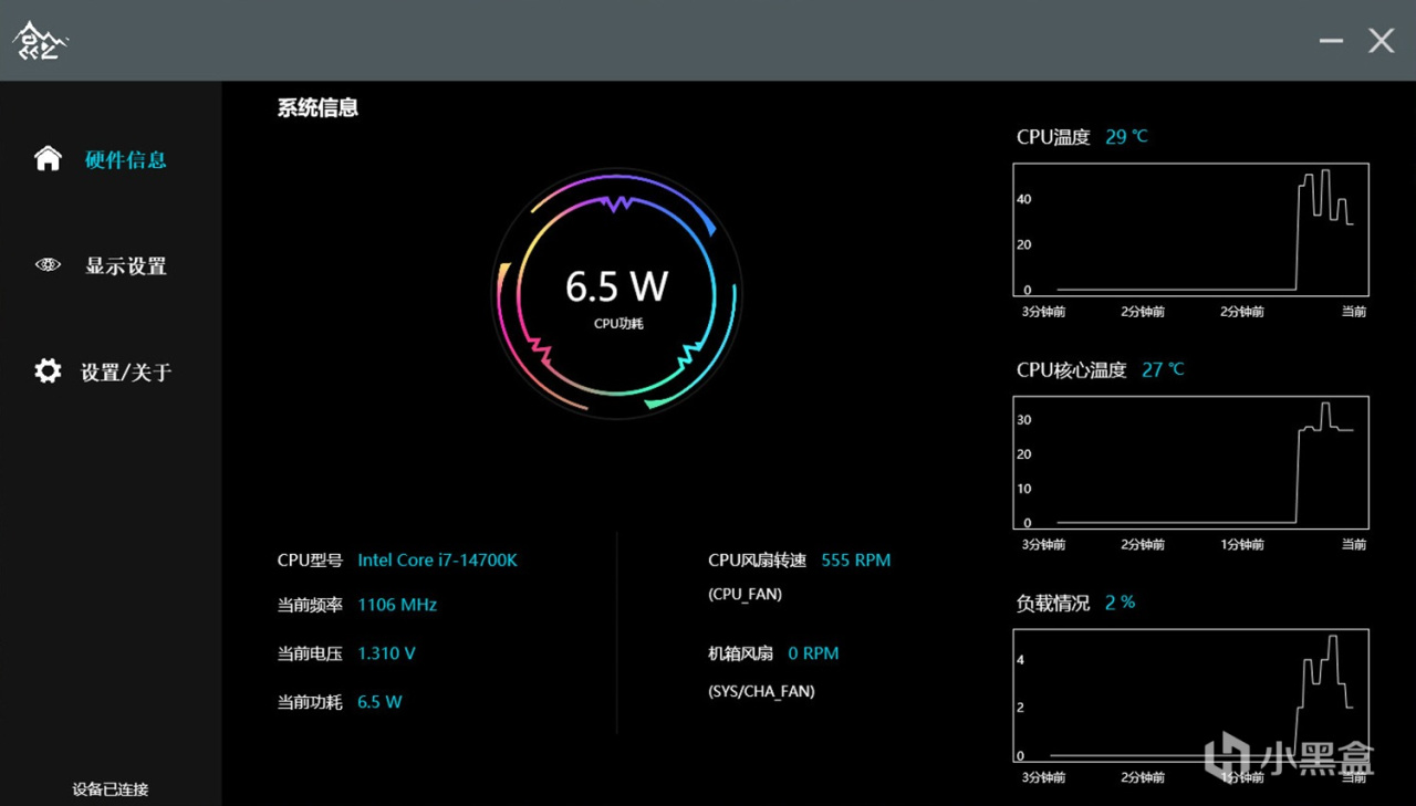 可在屏幕中設置顯示處理器當前運行狀態,這需要應用程序來輔助實現,若想要開機顯示,那需要設置開機自啓並賦予管理員權限,不然屏幕會無法顯示處理器狀態,在控制軟件的硬件信息界面中可查看處理器的負載溫度,散熱風扇轉速等狀態。