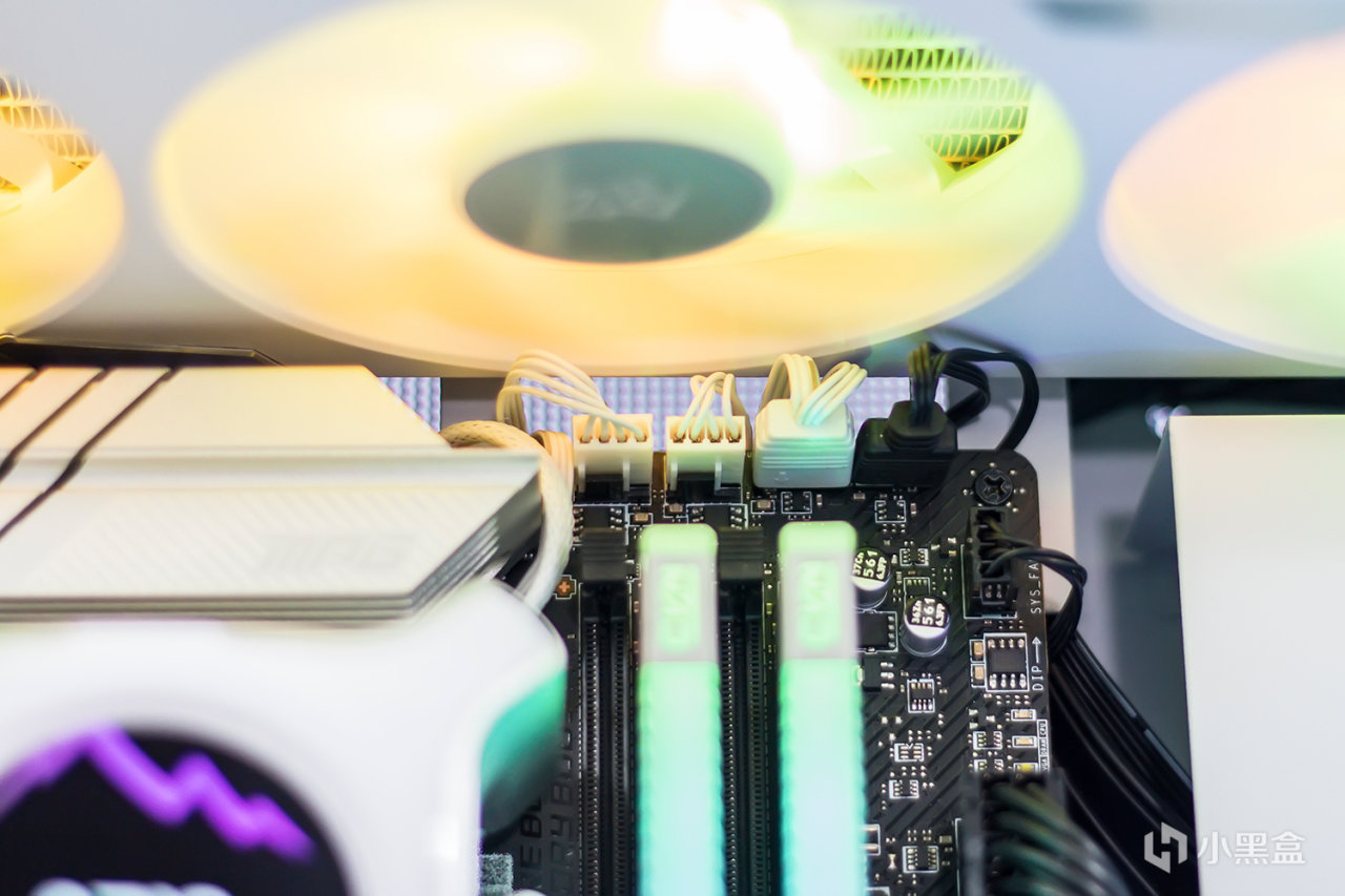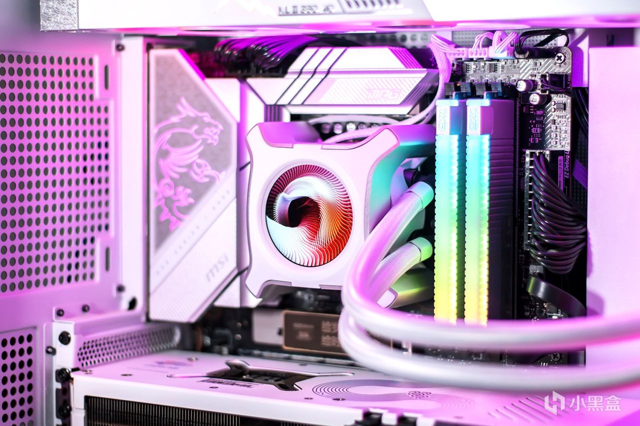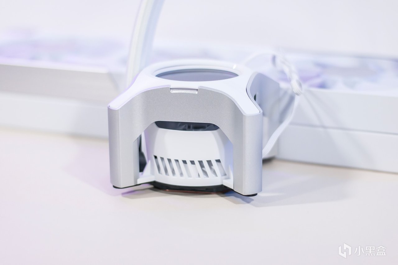 水冷散熱器的配備三個ARGB散熱風扇,支持多品牌主板的神光同步,乳白色的扇葉有着高透光效果,開啓動態燈效後幾乎整把風扇都在發光,燈光亮度可照亮整個機箱,搭配側透玻璃機箱的效果觀感不錯,既可單色也可流光溢彩,滿足不同用戶的動態光效需求,至於在水冷頭上並沒RGB燈光效果的。