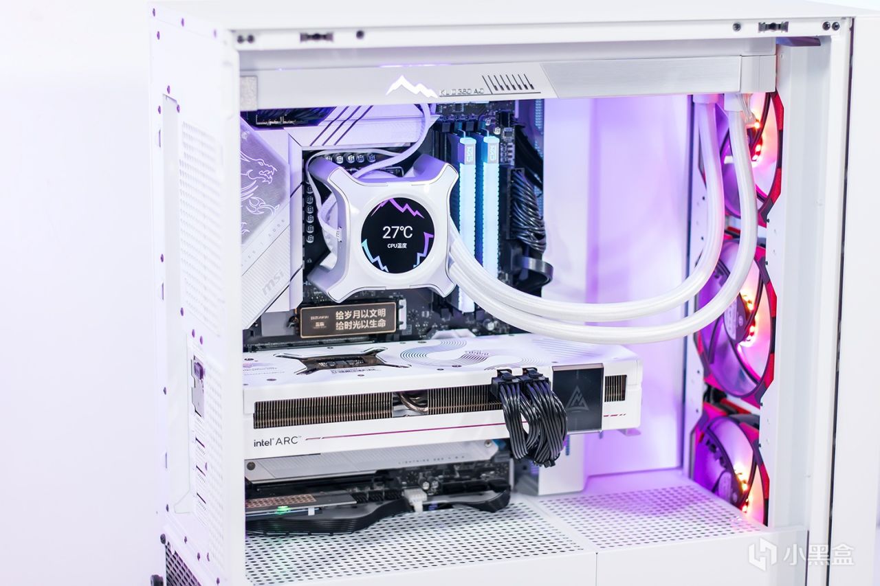 冷管的長度足夠且材質較軟,無論是安裝至機箱頂部或者主板右側均可,靈活且不會被長度所限,主機風道設計有可能會影響到整體散熱效果,合理的風道有利於散熱,本次將水冷散熱器的冷排安裝與機箱頂部往上排風,機箱前端安裝了三個12cm的散熱風扇往內部進風。