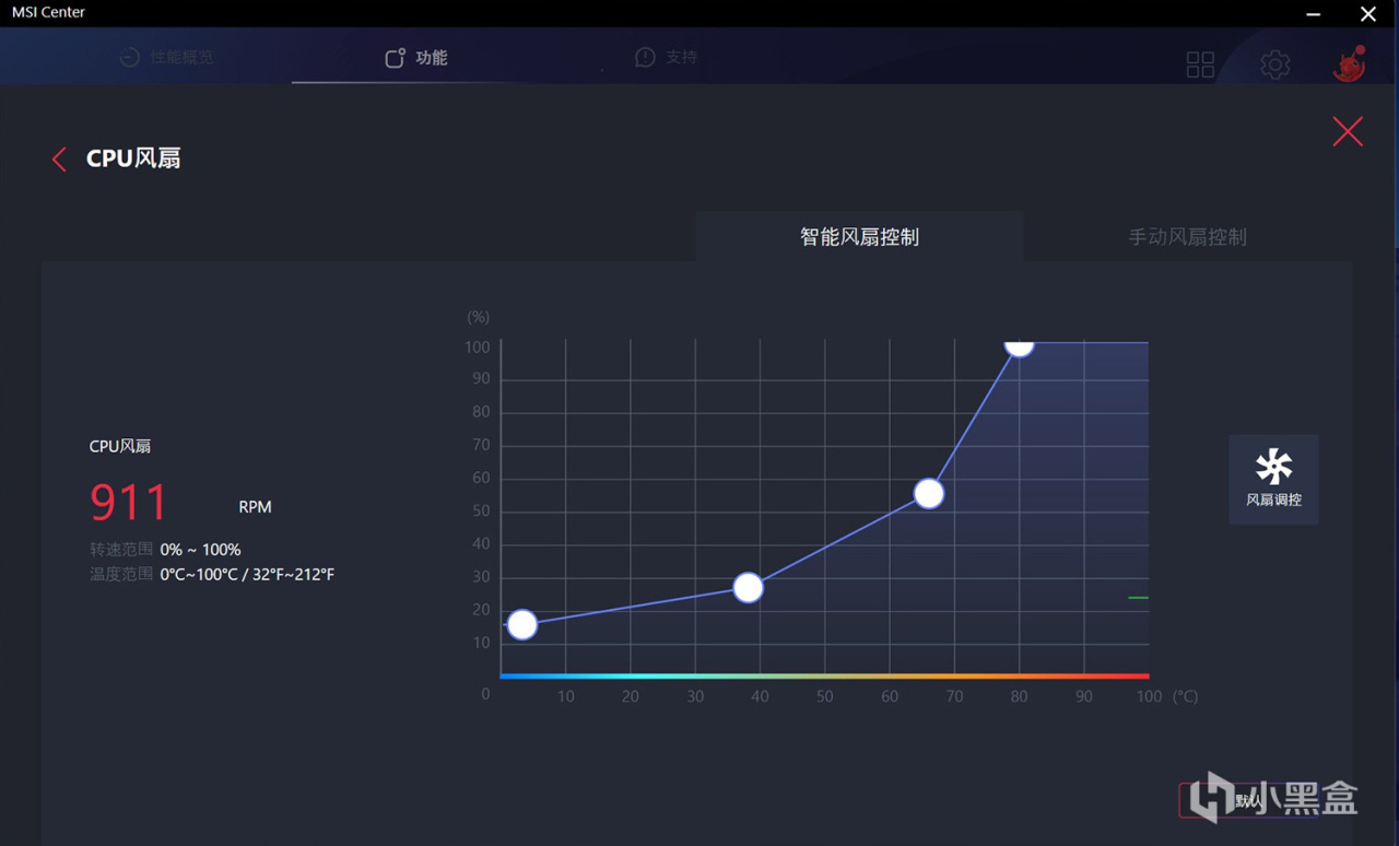 散熱風扇曲線設置如下圖,當處理器處於60℃以下時,讓散熱風扇維持最低轉速,當溫度達到80℃時將風扇轉速猛拉到頂,確保風扇全速工作下的運行狀態,這樣的曲線設置特點是,在輕中度負載時低轉速運行聲音也很低,而在中高負載時的轉速與聲音波動會較爲明顯。