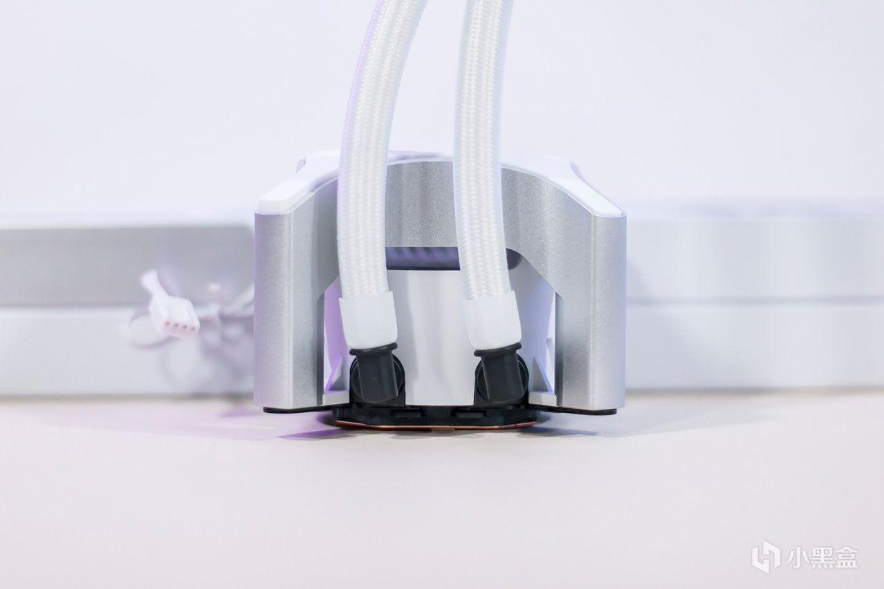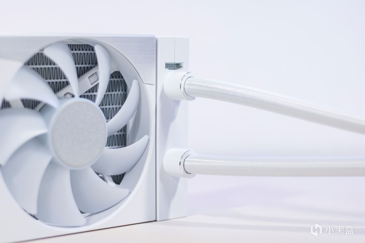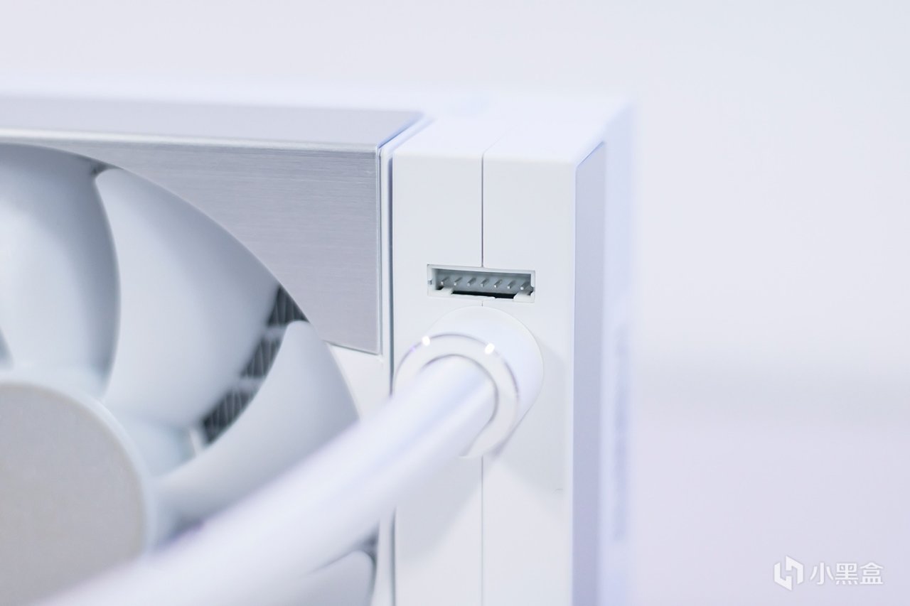 水冷散熱器配備長度爲450mm的FPDM冷管,表面覆蓋了蛇形編織網,位於冷管的兩端均有保護加固,讓其避免在安裝時受外力影響穩定性,傳統散熱風扇需要連接兩條線纜,分別是4Pin散熱風扇供電與5V ARGB燈效信號線,而這款水冷散熱器將兩條線材集於一體,位於冷管的上方爲一體式的HUB接口,需搭配專用有HUB線去連接至主板上。