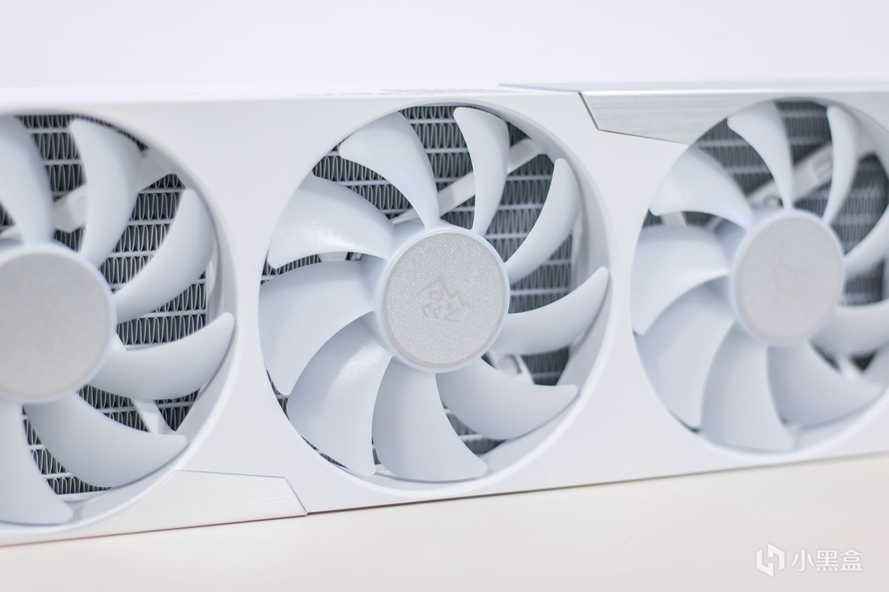 散熱風扇的安裝螺絲均隱藏在鋁合金材質的飾板下方,這種三個散熱風扇一體化設計確實挺新穎,無拼接隔斷在觀感上整體性更好,也可提高散熱風扇整體的強度,同時可增添更多特具特色的設計元素,比如位於散熱風扇的外側還設計了帶RGB燈效的崑崙徽標。