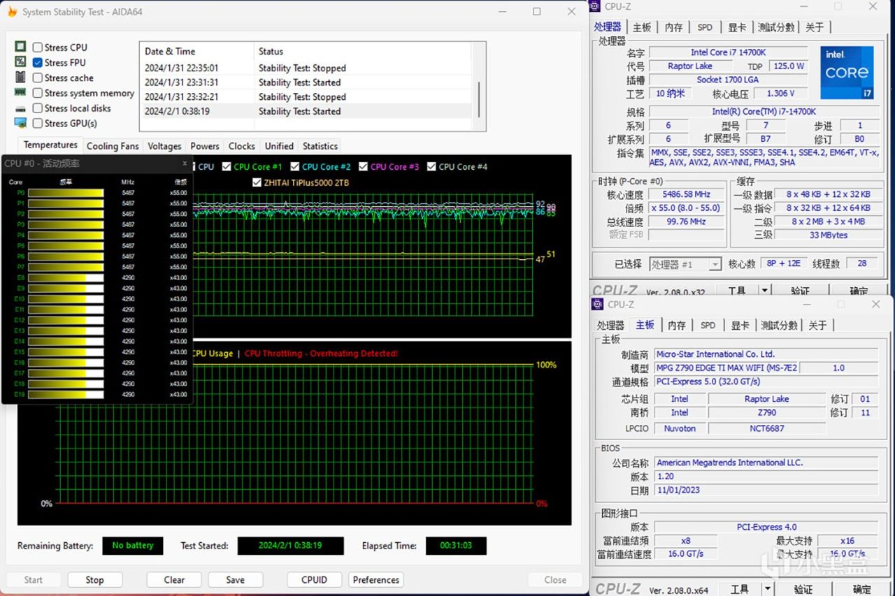在主板BIOS中解鎖功耗牆不降壓調參,測試時室溫爲24℃左右,直接進行FPU單烤壓力測試,根據監測軟件顯示,這顆i7-14700K處理器在單烤FPU時電壓爲1.306V,滿載時CPU Package功耗在300W左右浮動,而CPU Package處理器核心溫度穩定在92℃,完全沒有出現降頻等情況,可以穩壓處理器長時間滿載運行的發熱。