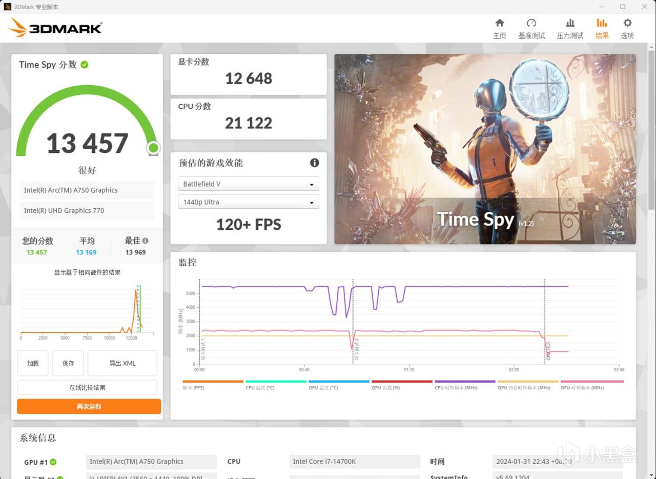 首先來個整機跑分,不清楚是什麼原因,處理器在CineBench基準跑分軟件中並未完全發揮多核性能,導致跑分成績偏低,那隻能跑3DMark基準測試軟件中的Time Spy項目,總得分爲13457,顯卡圖形得分爲12648分,這塊A750顯卡性能與RTX4060相若,處理器性能得分爲21122分。
