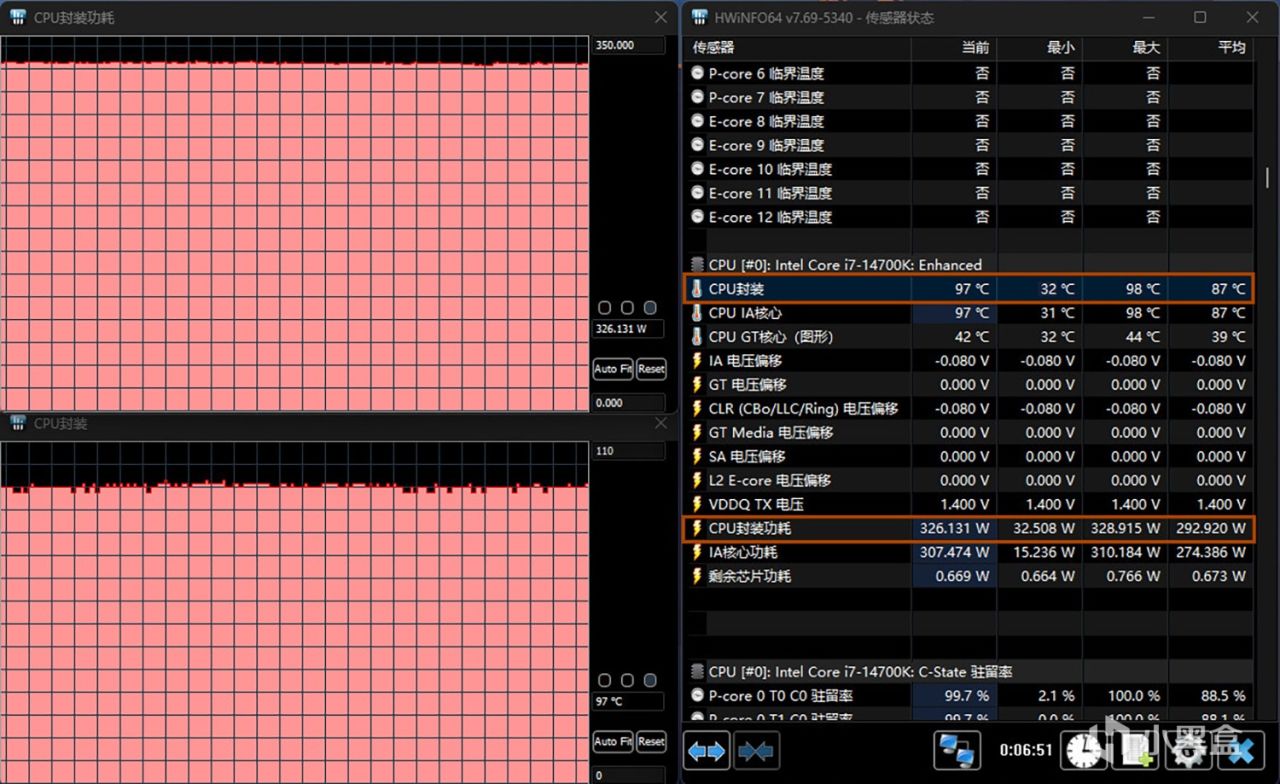 通過處理器超頻進一步挑戰這款水冷散熱器的上限,將全核頻率均提升了0.1GHz,滿載功耗直接上到326W,所獲得的性能提升與功耗相比完全不對等,因此這顆處理器的原生頻率已是上限,實測烤機五分鐘未觸發溫度牆,散熱器依然能夠壓得住,且能確保持續穩定工作。