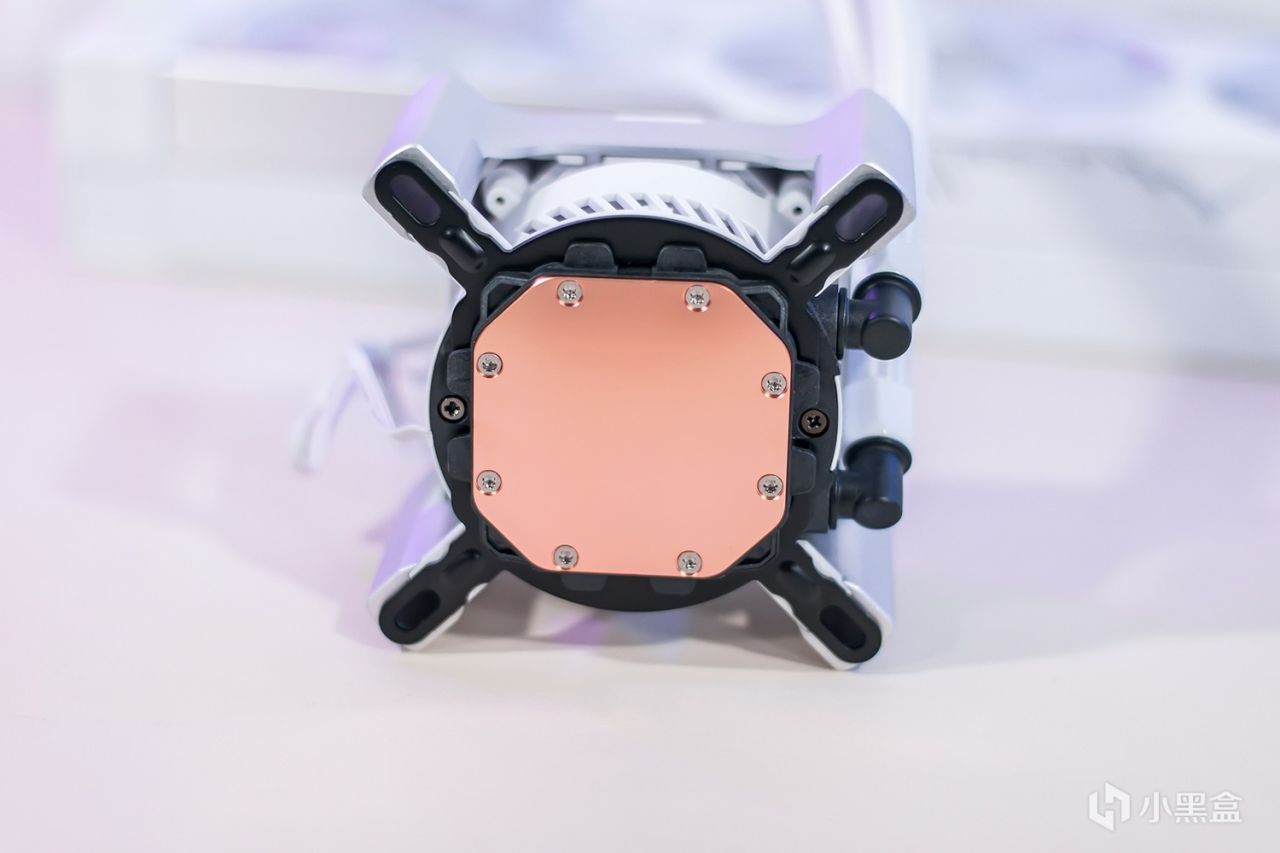 水冷頭的底部爲純銅底座以及八顆固定螺絲,增加導熱效能,隨機附帶了來自道康寧的導熱硅脂,導熱係數可達5.2W/m.k,硅脂粘度屬於中等偏上,擠壓塗抹還算輕易方便,在出廠時預裝Intel處理器的扣具,假如是AMD平臺需要將兩側扣具取下並更換至專屬的扣具。