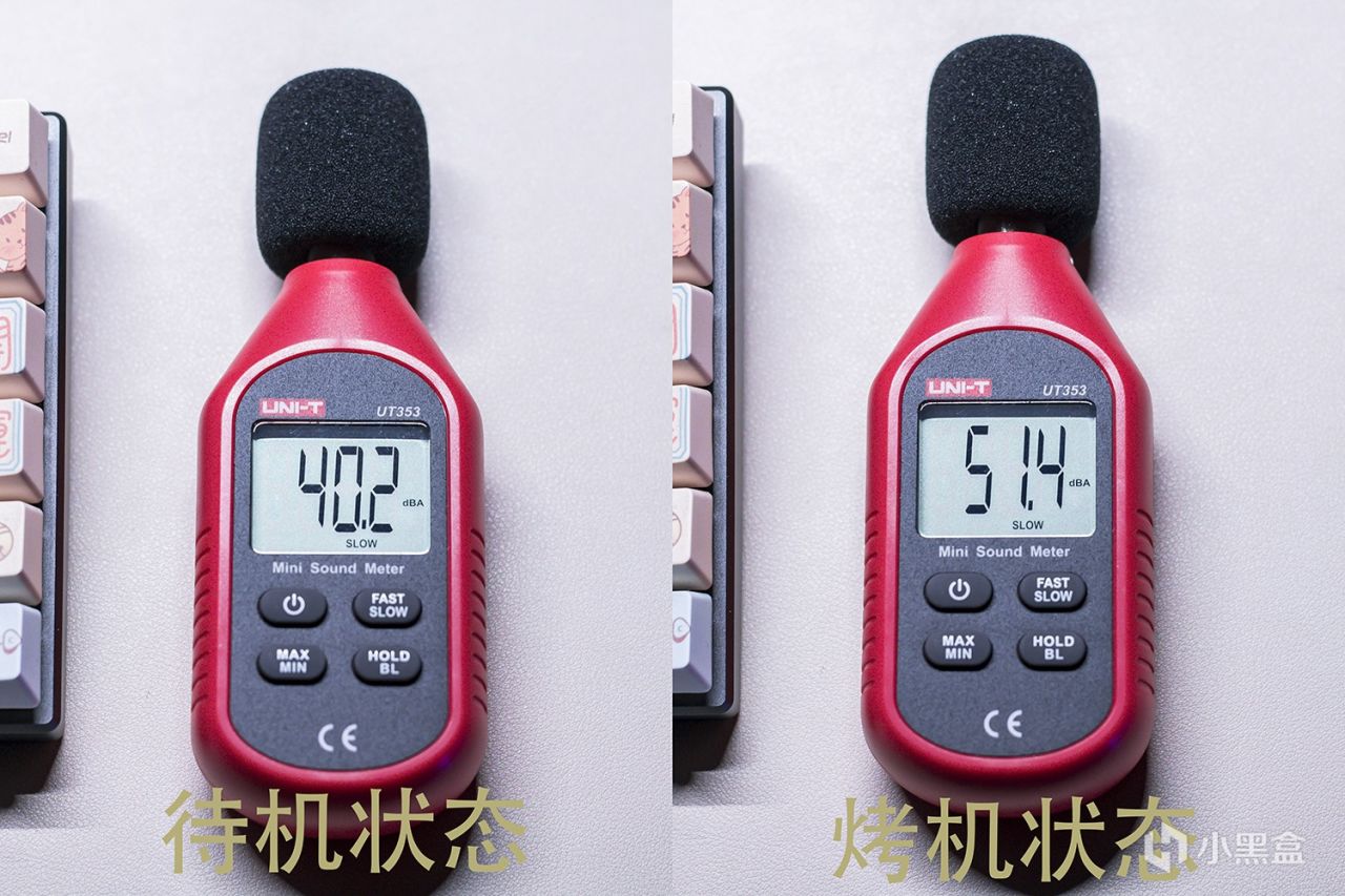 由於使用開放式機箱屬於少數,絕大部分都會將水冷散熱器裝在傳統機箱當中,本次運行噪聲將主機放置於顯示器的右側,關閉機箱前部的三個散熱風扇,將噪音儀放置於機械鍵盤的右側,與機箱距離約爲30cm,待機時噪音值40.2dBA,滿載運行的噪音值爲51.4dBA。
