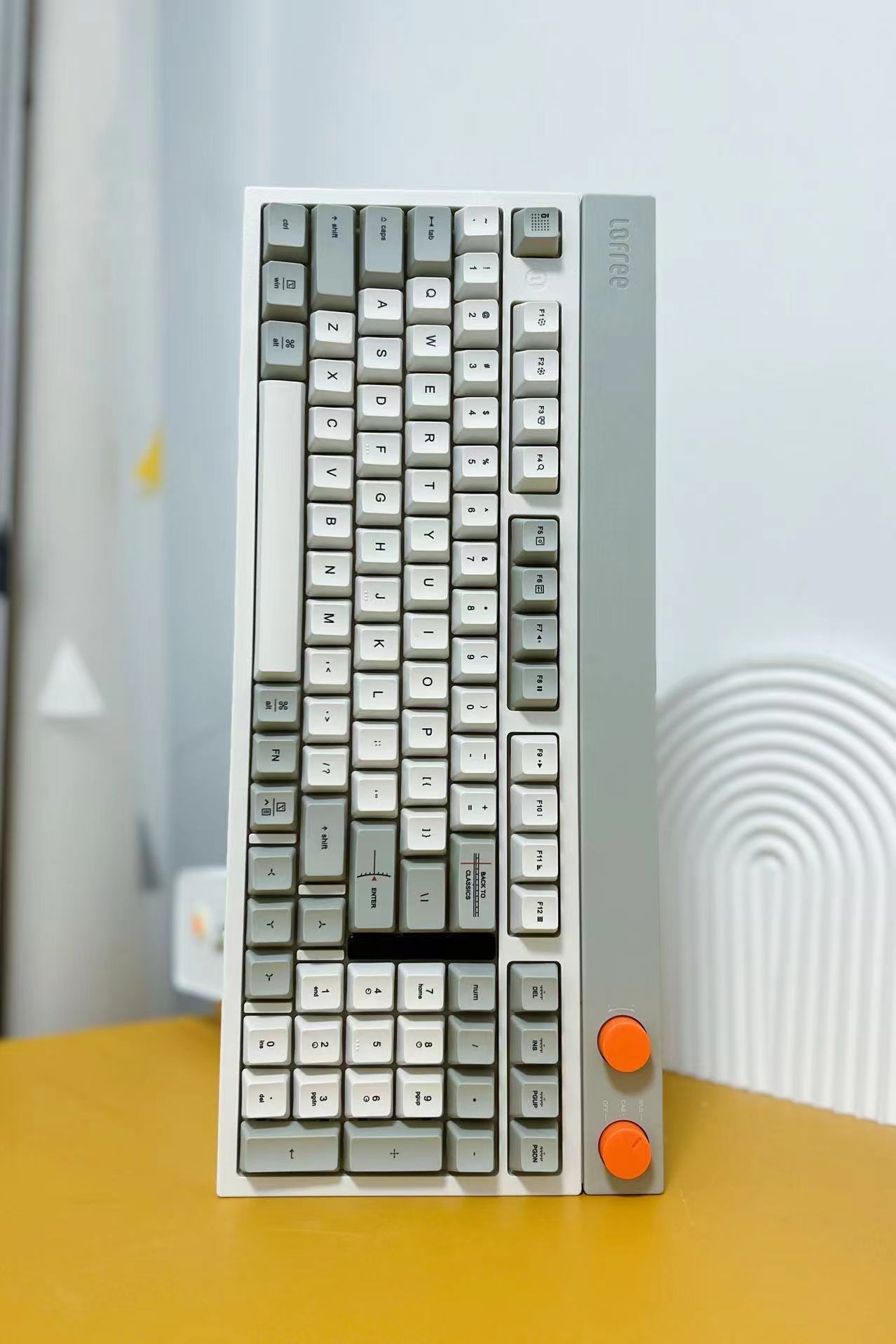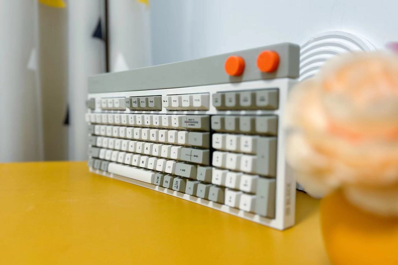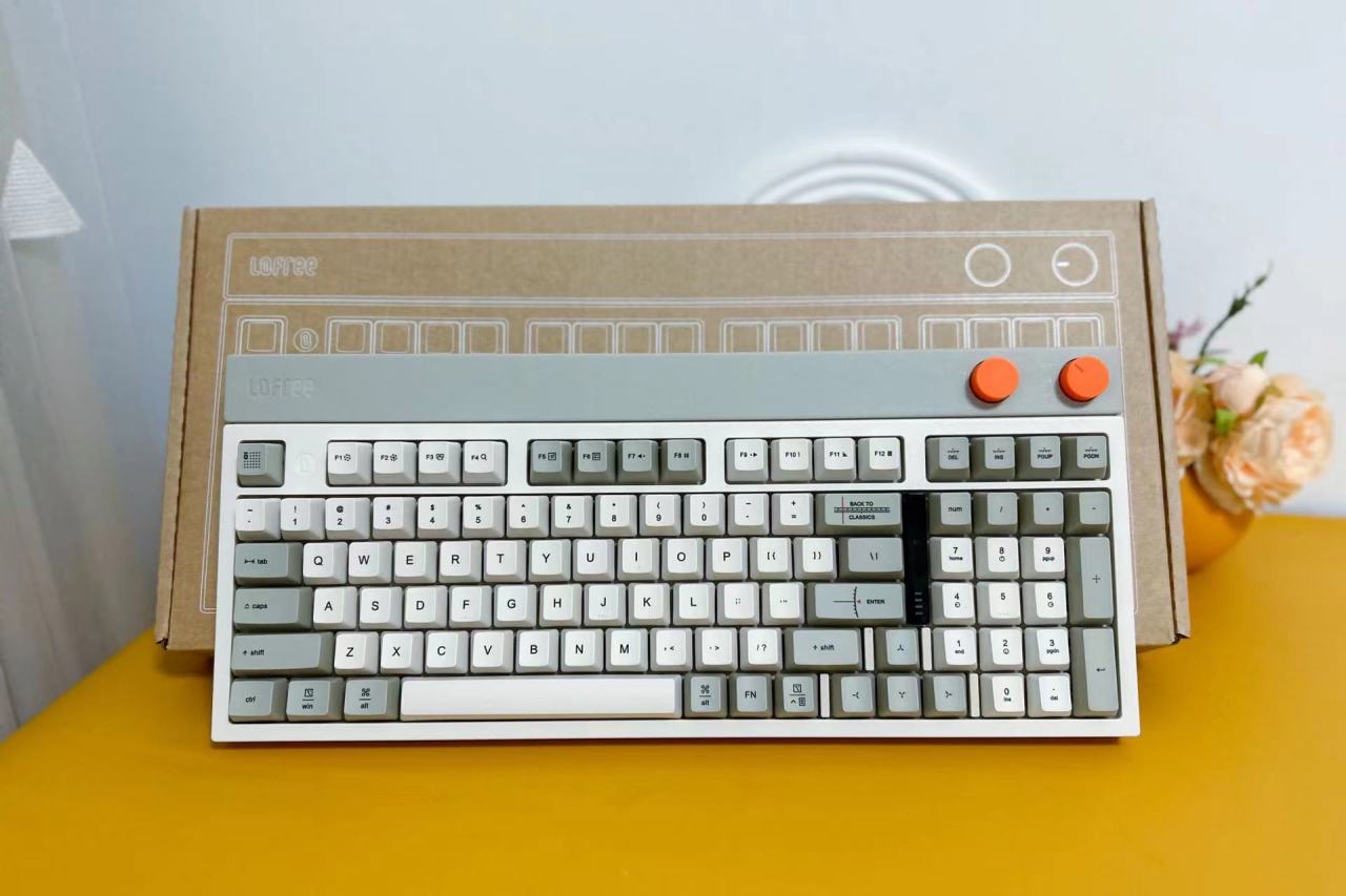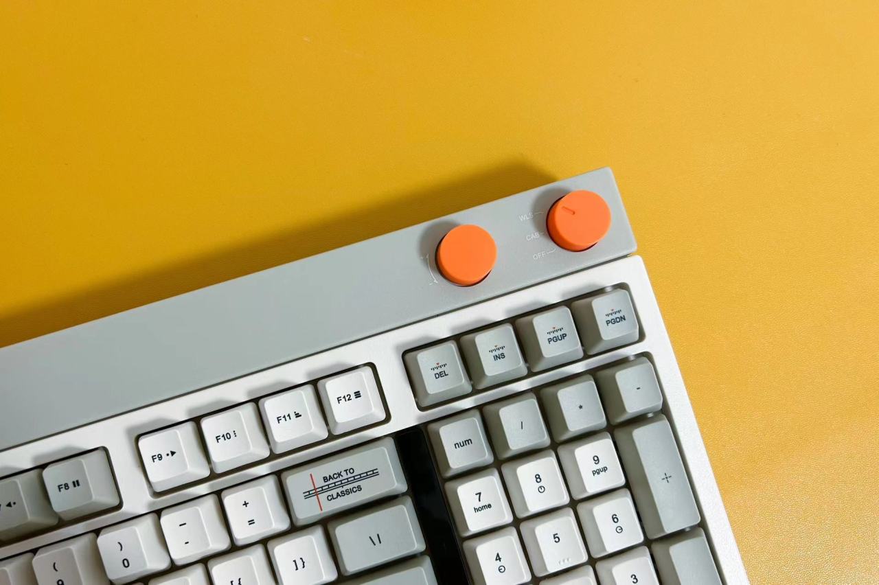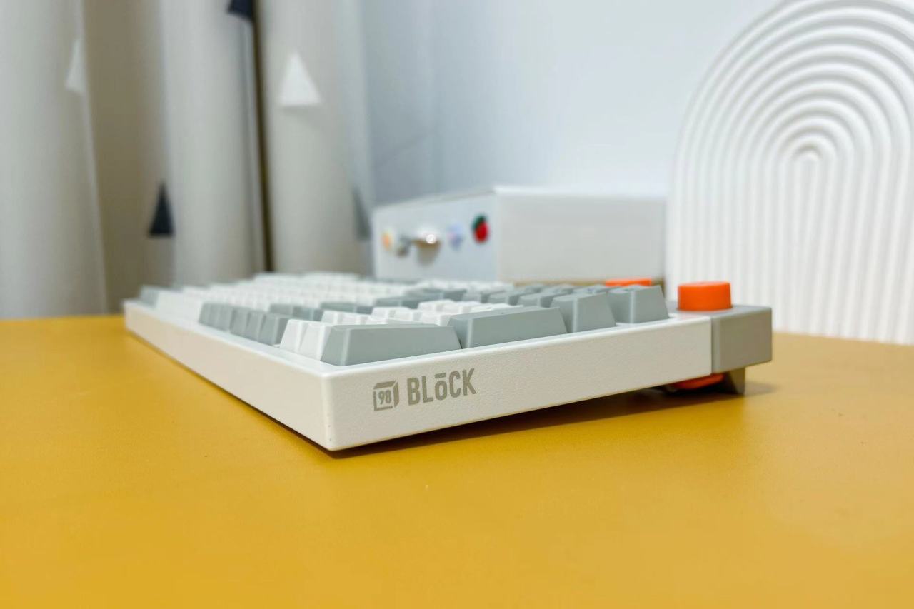 拆开塑封袋,第一眼看到的是洛斐小方98三模机械键盘简约大气的外观设计,给人一种复古的感觉,同时又融入了非常现代科技元素。98键布局的设计,让键盘在保留常用功能的基础上,更加紧凑实用。拥有完整的功能键区、独立方向键和数字区,只舍弃了少数不常用的功能键,使得桌面空间更加简洁实用。橙色的多功能旋钮设计不仅美观,而且功能实用,让用户可以方便地调节音量和连接模式。