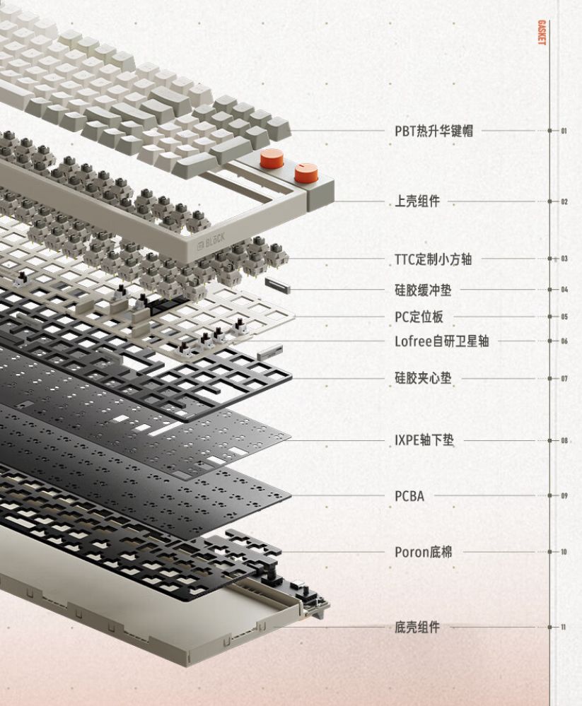 此外,键盘结构采用了Gasket结构、TTC定制小方轴、硅胶缓冲垫、PC定位板、PORON消音棉等多重材料堆叠,确保消音效果纯粹,键盘声音清脆,手感柔软弹性十足,打字体验非常舒适。