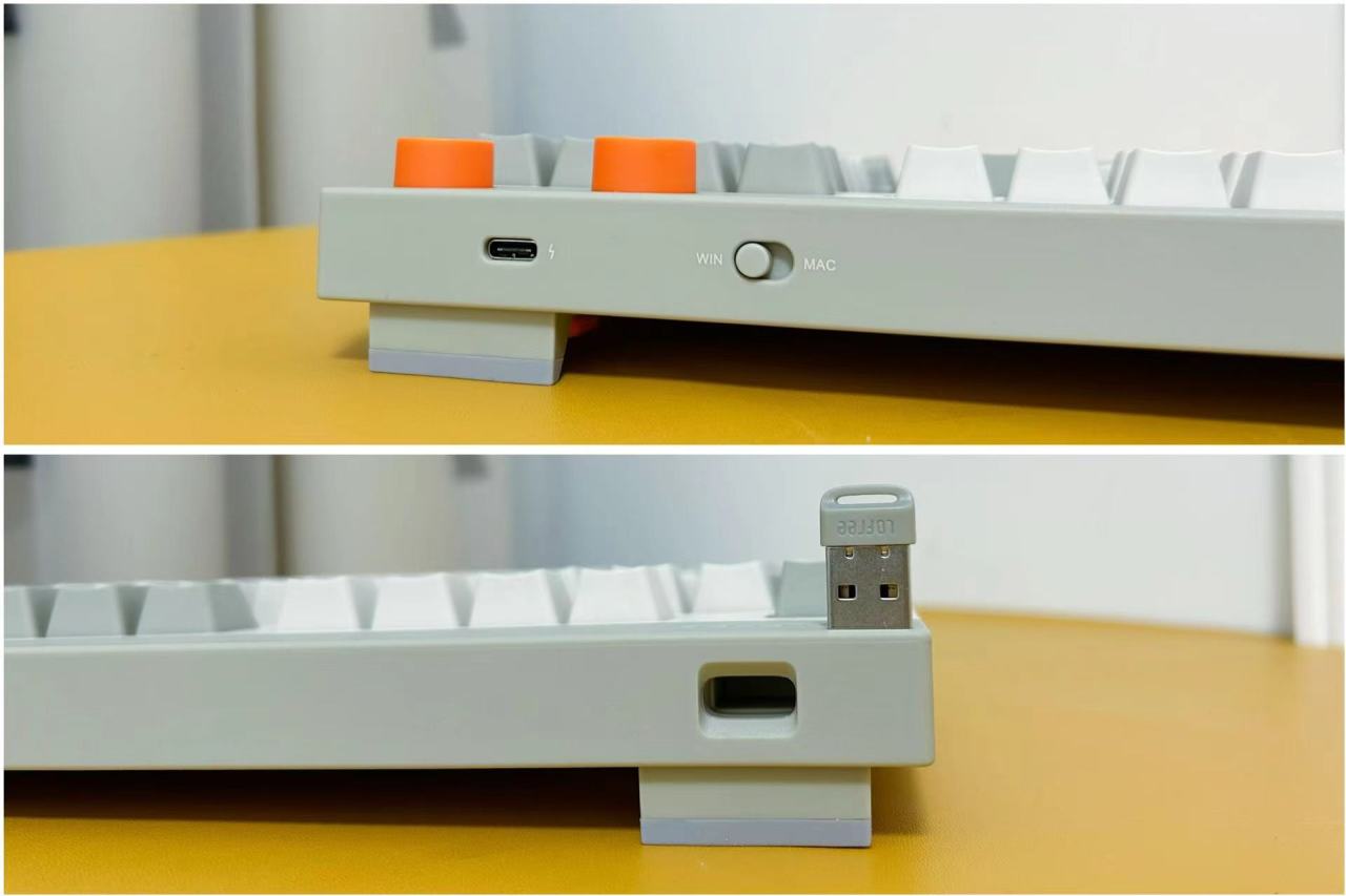键盘后方设有Type-C充电口、Win和MAC模式切换按键,而与之对称的左后方则隐藏了2.4G磁吸接收器,方便收纳且不易丢失。