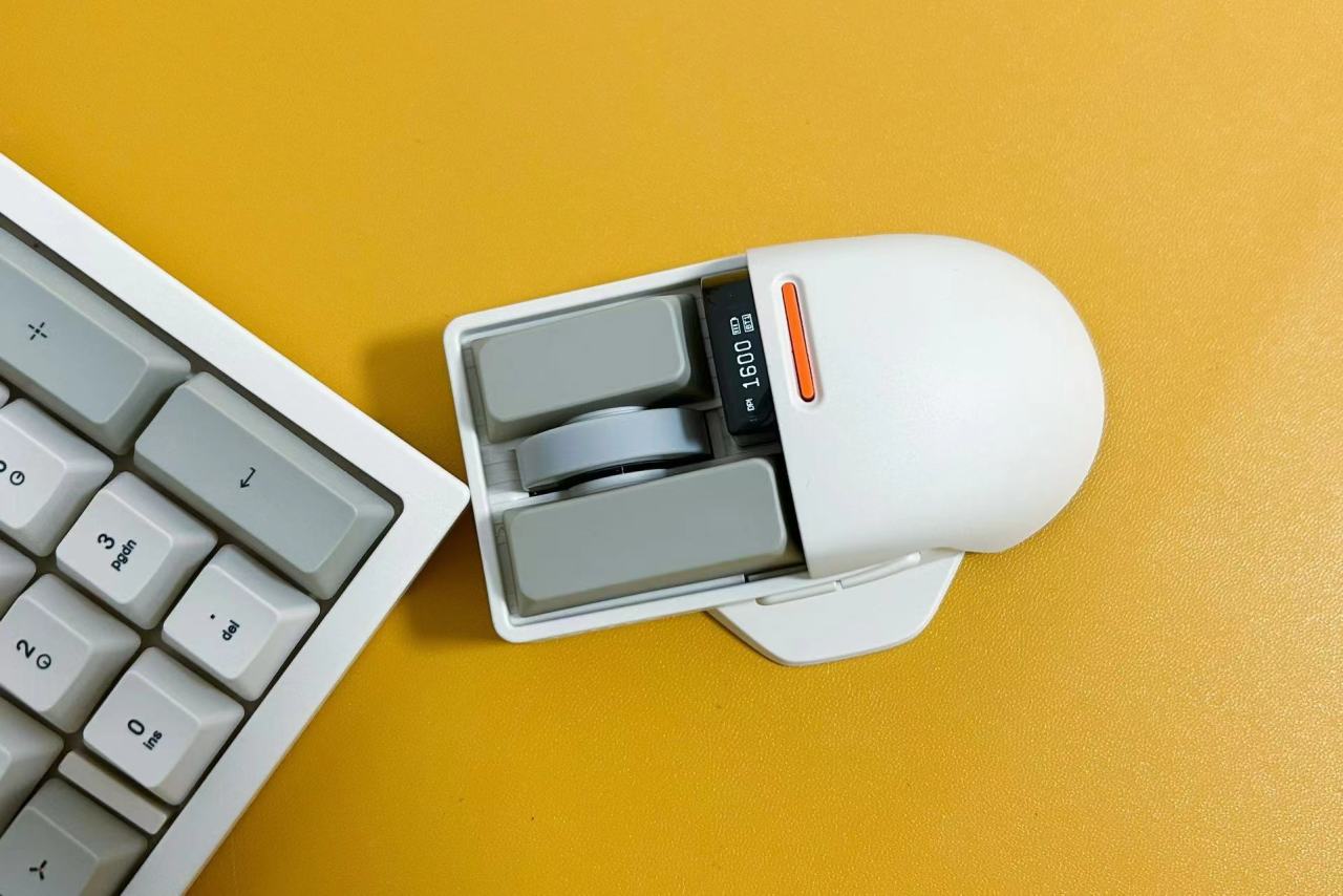 鼠标底部设计有4个硅胶防滑垫,传感器位于中间位置,旁边是开关建和模式切换键。2.4G接收器收纳仓在尾部。支持有线、蓝牙、2.4G三种模式连接,支持一键切换多个模式,可以同时连接4个不同设备,内置了650mAh锂电池,续航能力优秀,搭配键盘使用效果出色。