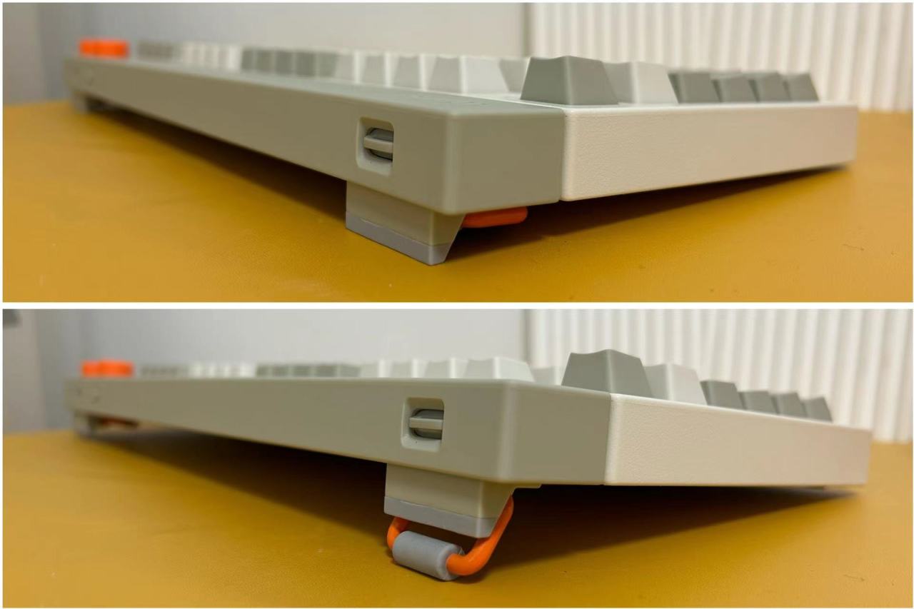 键盘底部采用了一段固定脚撑和一段可调节硅胶脚撑。橘色+灰色的设计独具特色,具有强烈的识别度,与正面旋钮的配色相呼应,不仅可以根据使用习惯调节键盘倾斜角度,同时也体现了产品的精致感。