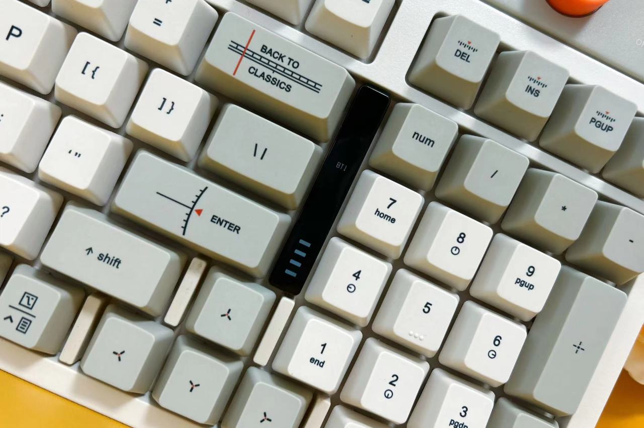 此外,在回车键和数字区之间还设计了一个可视状态指示面板,方便查看键盘状态,包括电量、数字区开关、大小写锁定、蓝牙连接和2.4G状态指示。这个小小的显示屏设计为键盘增添了一丝惊喜。