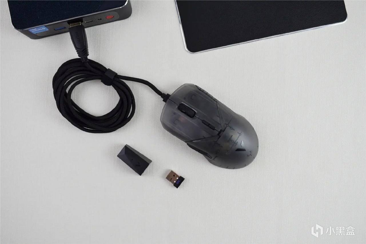 这一次产品包装更加时尚精致,配件也是一如既往的丰富,包括USB转接器、数据线、备用脚贴、侧裙防滑贴、按键防滑贴和快速指南。