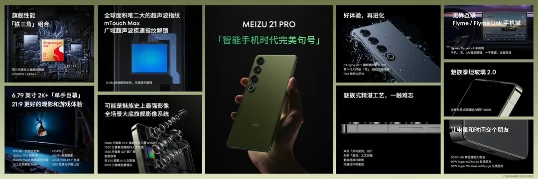 屏幕部分:6.79英寸OLED直屏,屏幕为京东方Q9+基材,3192×1368分辨率,120Hz刷新率,2160Hz高频PWM调光,魅族泰坦玻璃2.0