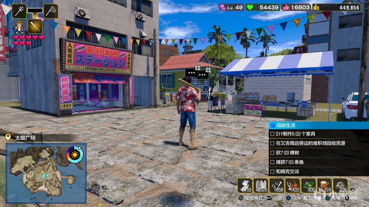 太鼓島,同樣作爲另一個大支線,對於這部分內容的評價可能會兩極分化,喜歡的人會拋棄主線停不下來,不喜歡的人除了開頭強制上島之後就再也不想登島,而我屬於後者。在這裏,玩家需要將已經荒廢的島嶼重新打造成度假聖地,融合採集,製作,建造,戰鬥,迎接遊客、甚至利用收服的江湖寶貝爲你打工(我們如龍玩家有自己的帕魯),似乎一款模擬經營遊戲該有的要素基本齊全。在我瞭解了這個支線的玩法機制後,對太鼓島我只能用又肝又枯燥來評價。