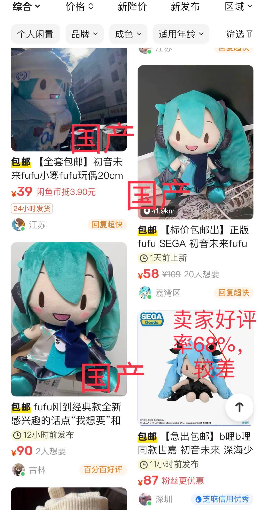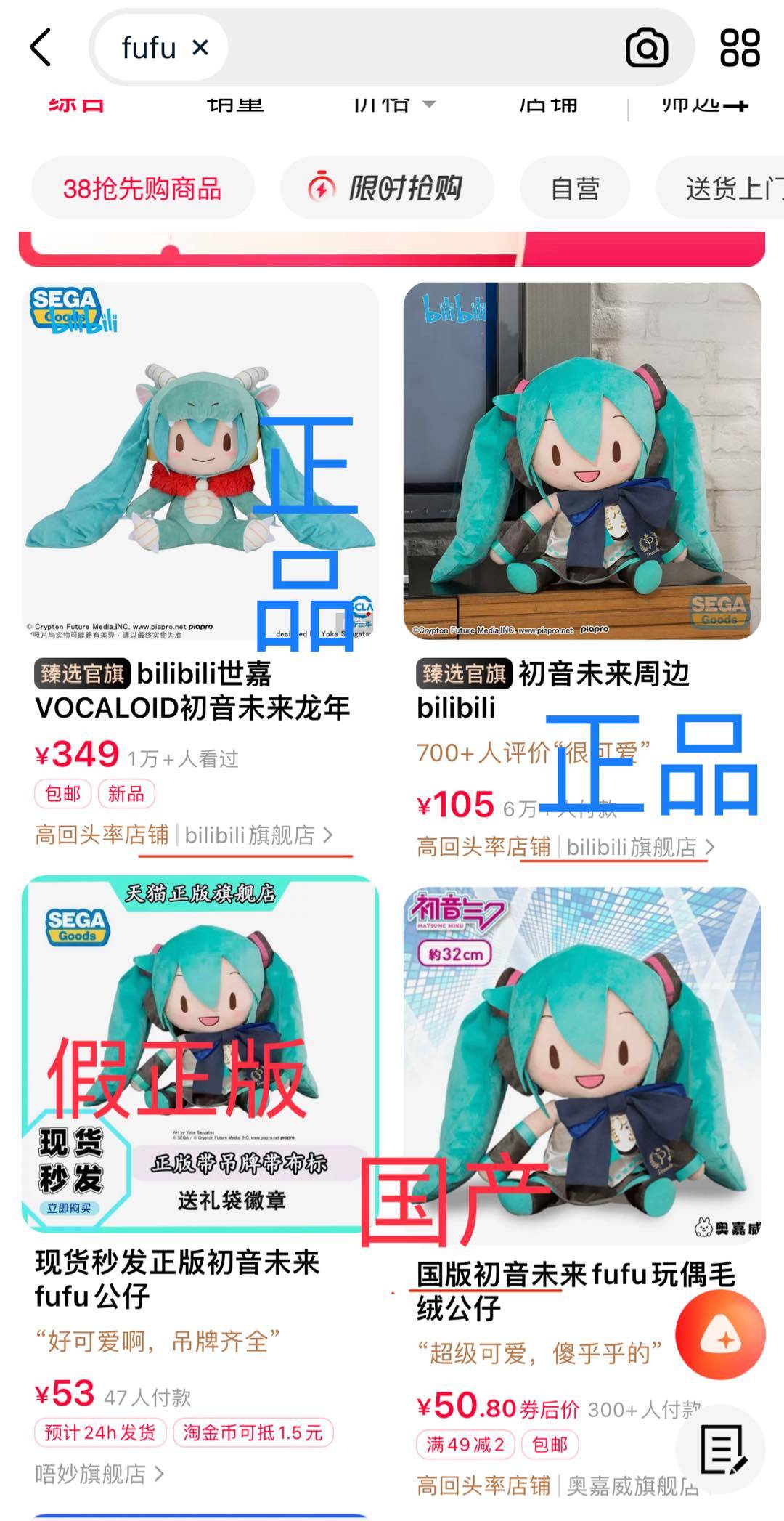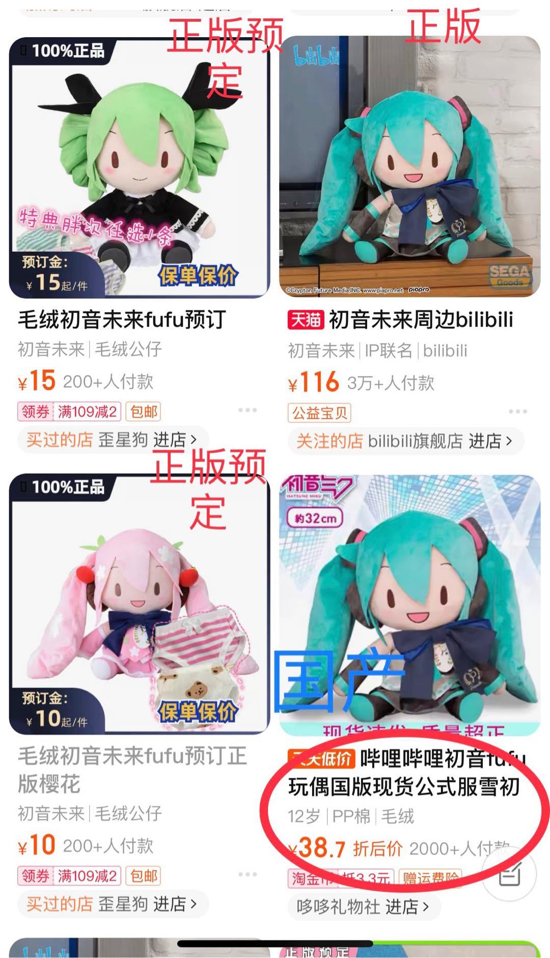 - 淘寶、天貓、京東:大部分都是國產盜版fufu,除非是bilibili旗艦店和其他旗艦店,以及一些SEGA世嘉官方授權的店鋪。在鑑別的時候還可以多多注意店鋪評分,銷量和真實買家評價(不含刷單和託)。