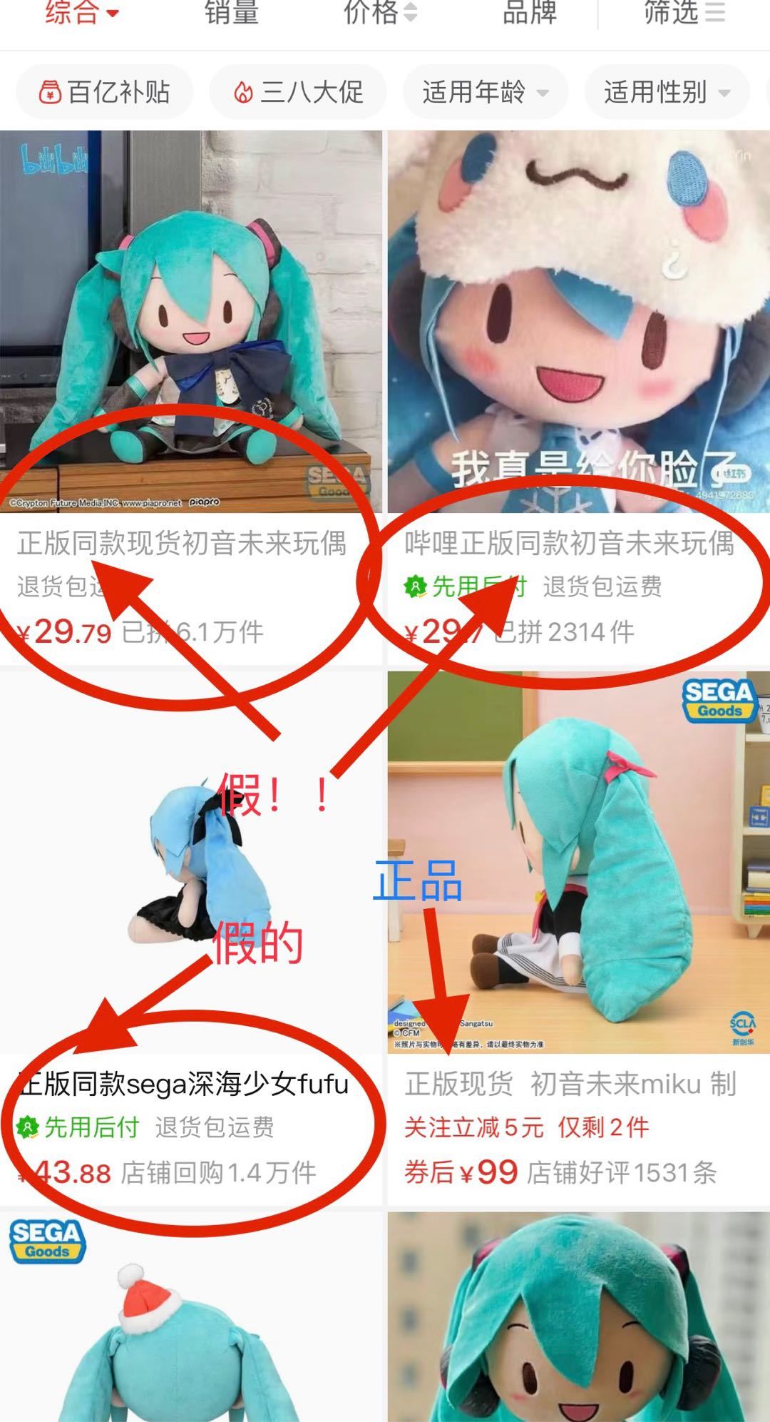 不少國產商家喜歡使用小後綴的描述來模糊概念,例如“正版同款”“嗶哩嗶哩同款”“日版”“SEGA正版同款”“優質版”等等來吸引買家購買,方便售後扯皮耍賴。