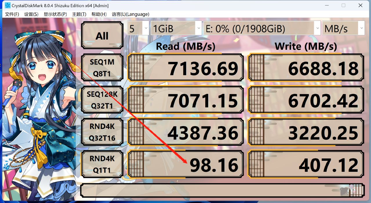 而空盤狀態下Q1T1 4K隨機讀取速度達到了93.04MB/s,雖然這測出來的是SLC Cache內的寫入表現,但無論如何這也是消費級PCIe4.0 SSD中的旗艦水平了。