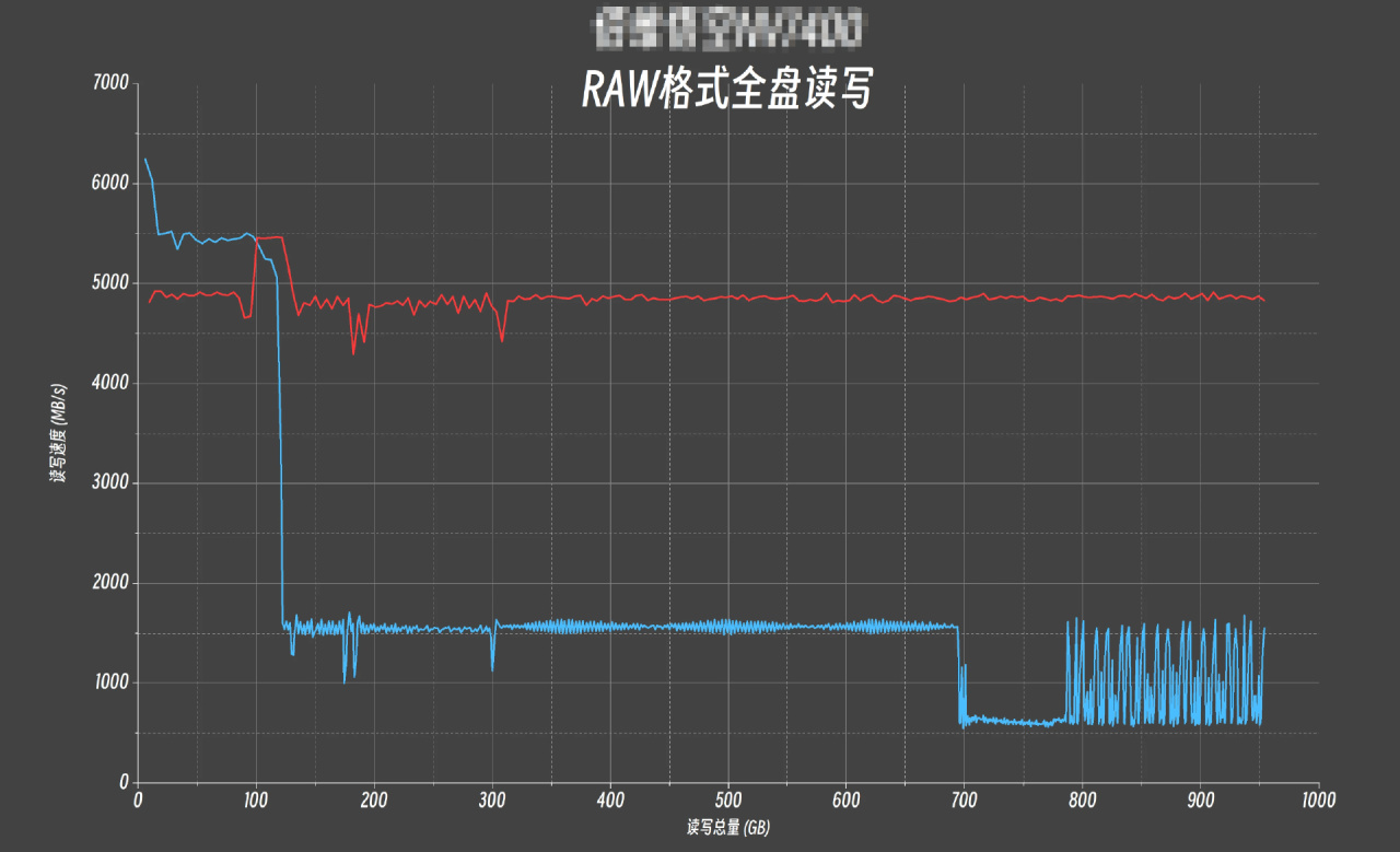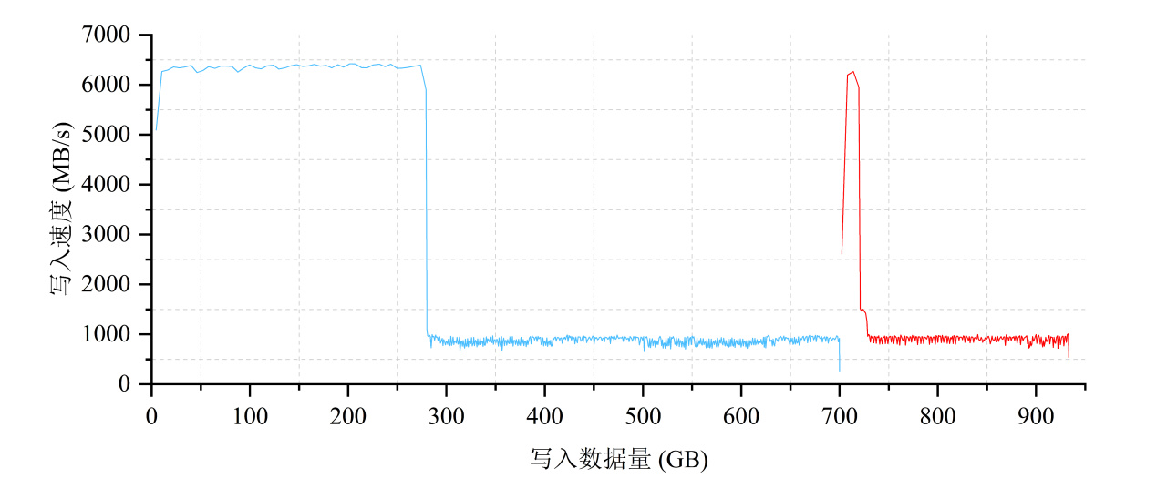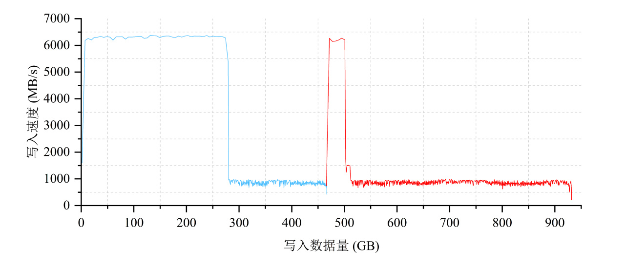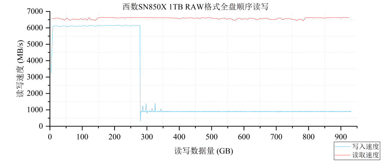 爲了深入探索SN850X 1TB的SLC Cache方案,這裏我們對其進行RAW格式下的全盤順序寫入測試(128KB,Q32T1),並以曲線圖的形式爲大家展現。