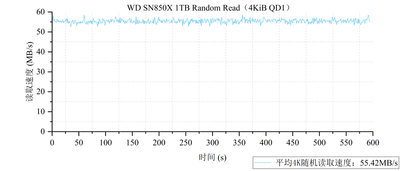 經過測試,SN850X 1TB的SLC緩外真實4K隨機讀取速度在55.4MB/s左右,要超出普通DRAM-Less無緩盤一大截,而這也是有緩盤的最大性能優勢之一。