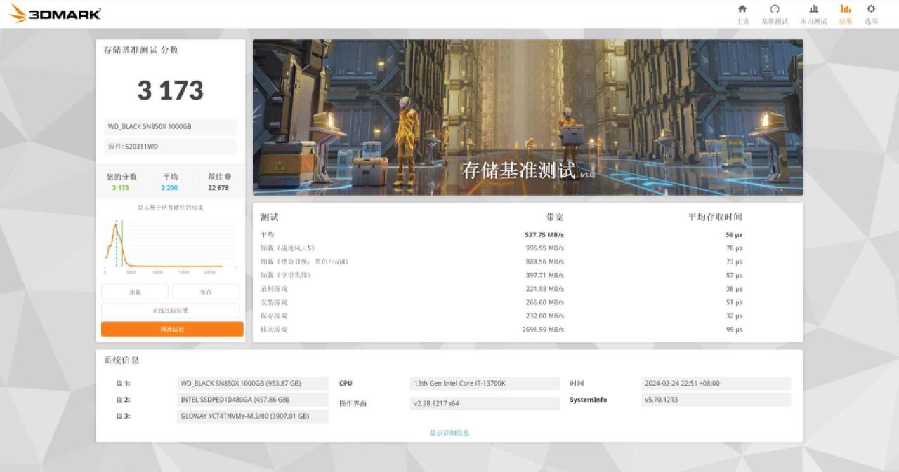 如果說PCMark 10的完整系統盤測試是從系統盤角度來衡量SSD的性能表現,那3DMark的存儲基準測試則可以從遊戲盤性能的角度對SSD進行評估,通過回放腳本,從中衡量存儲設備對遊戲體驗的影響,對遊戲玩家有很強的參考價值。