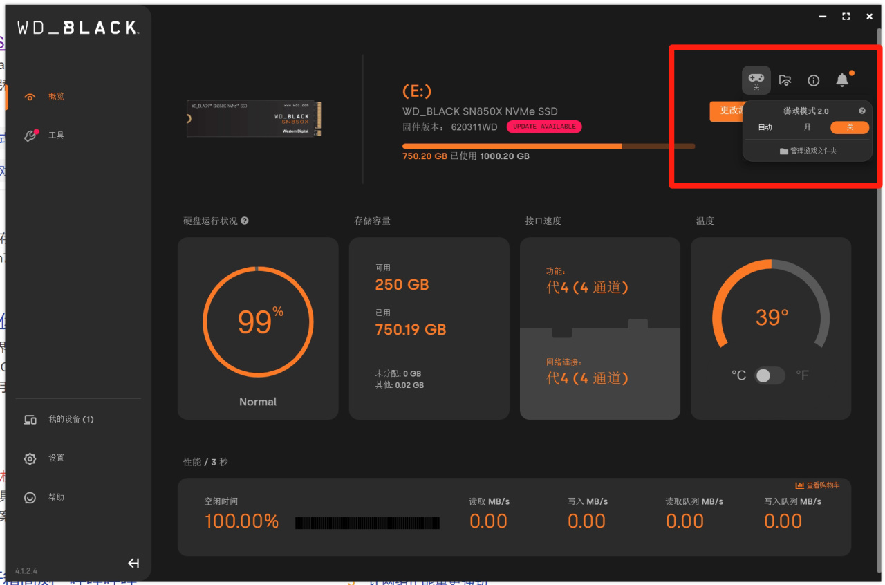 SN850X作爲WD_BLACK黑盤系列,本身定位就是遊戲領域的旗艦SSD。在DashBoard中,我們可以自行選擇是否啓用它的遊戲模式,啓用後每隔幾秒鐘,系統就會向SN850X發出讀取數據的申請,從而避免SN850X進入休眠狀態,提高數據讀取時的響應速度。