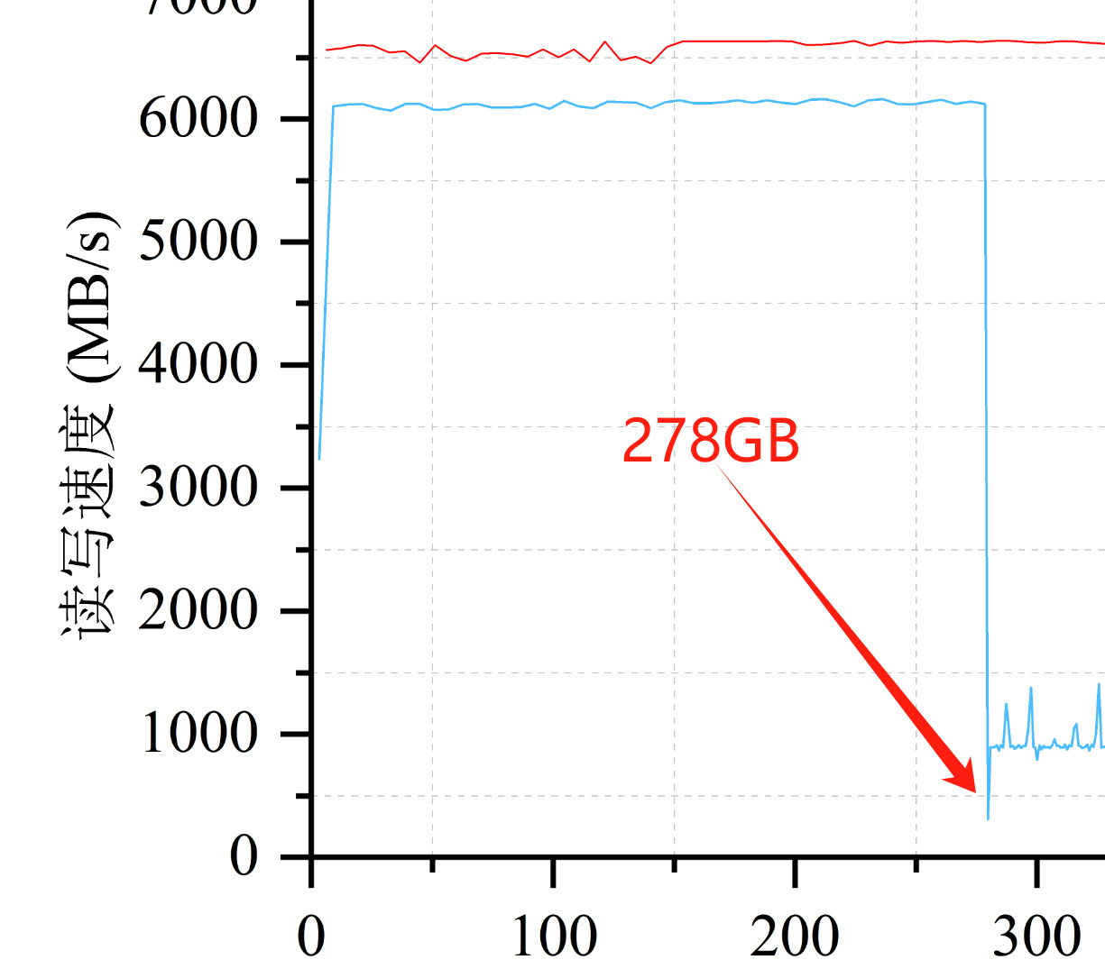 這使得滿速PCIe4.0 SSD能夠在短時間內達到7000MB/s以上的超高寫入速度,但是當SLC Cache耗盡時繼續一直寫入,最終速度就會降下來進行SLC至TLC狀態的垃圾回收操作,影響到後半程的寫入速度。