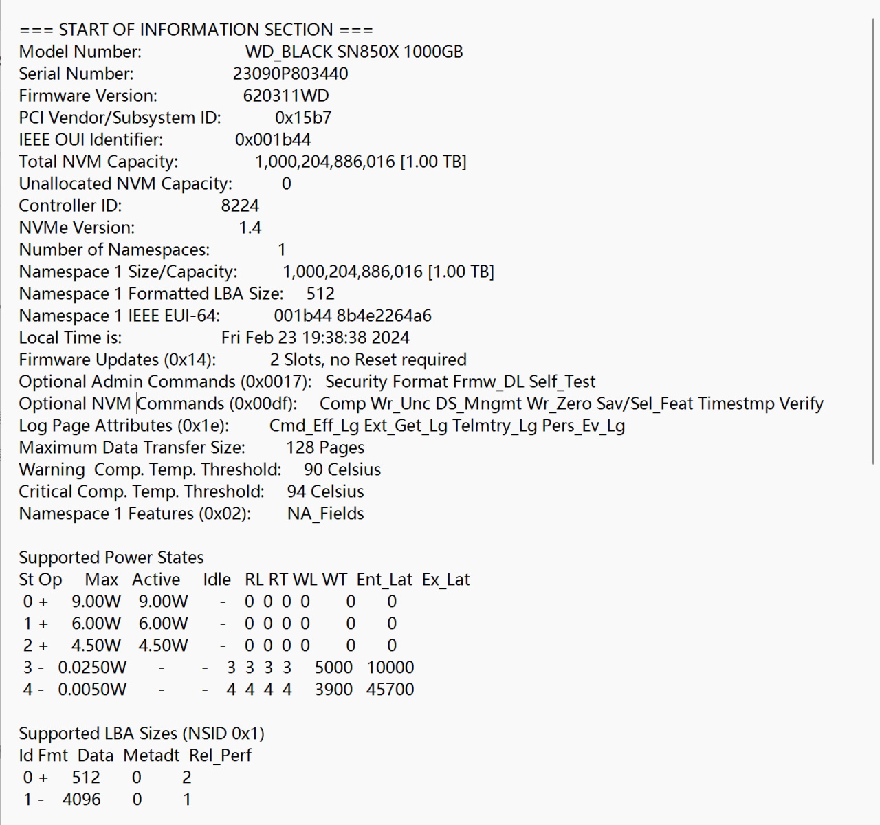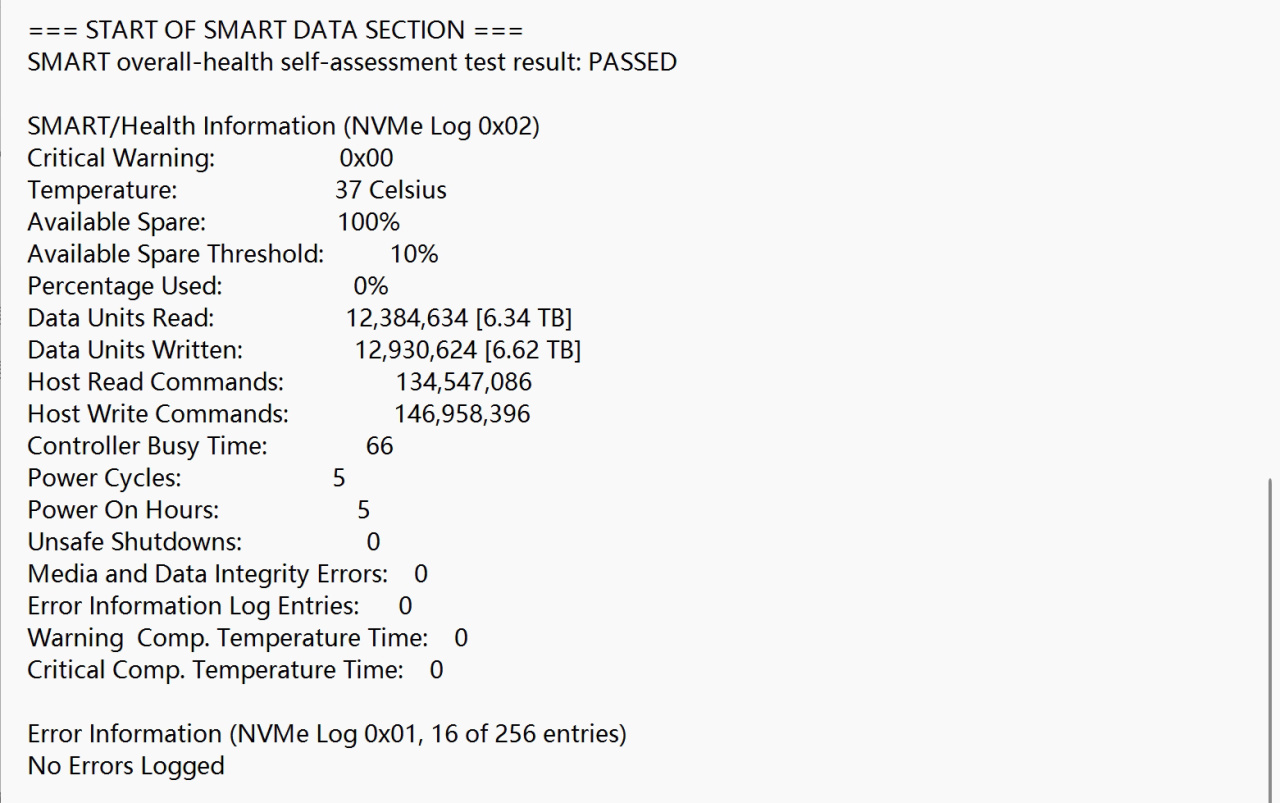使用smartmoontools看一眼,WD_BLACK SN850X 1TB默認給了5種功耗檔位,分別是9W、6W、4.5W和0.025W、0.005W。最高9W的滿載功耗要比普通DRAM-Less無緩盤高出了2W多,大家在使用過程中記得給這塊盤做好散熱措施。