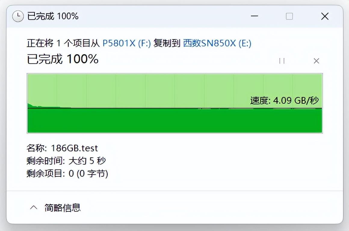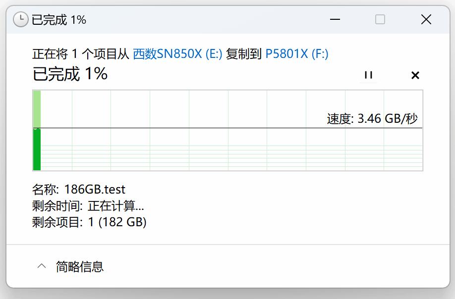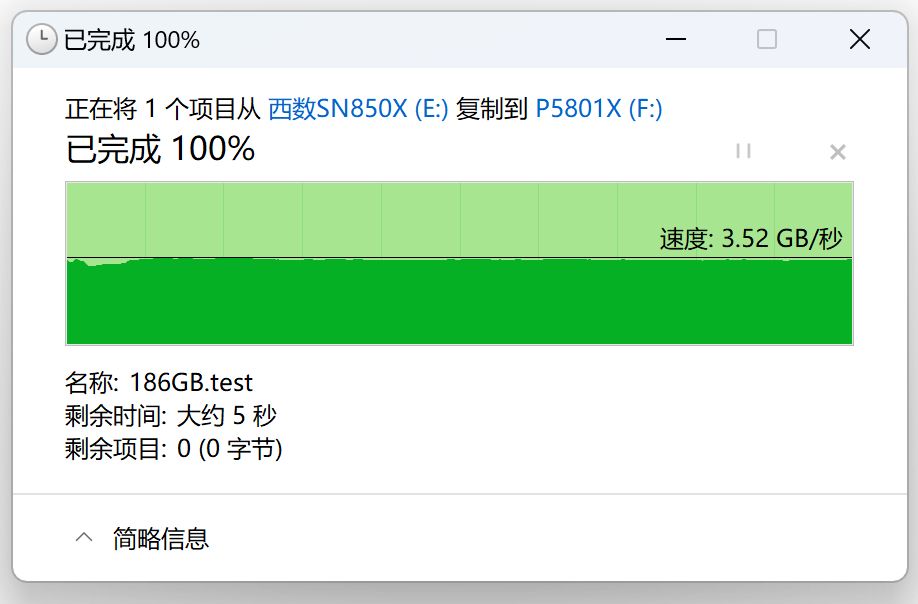 而將這個文件從SN850X複製到傲騰P5801X時,速度則可以保持在3.5-3.6GB/s之間,也是非常快的。